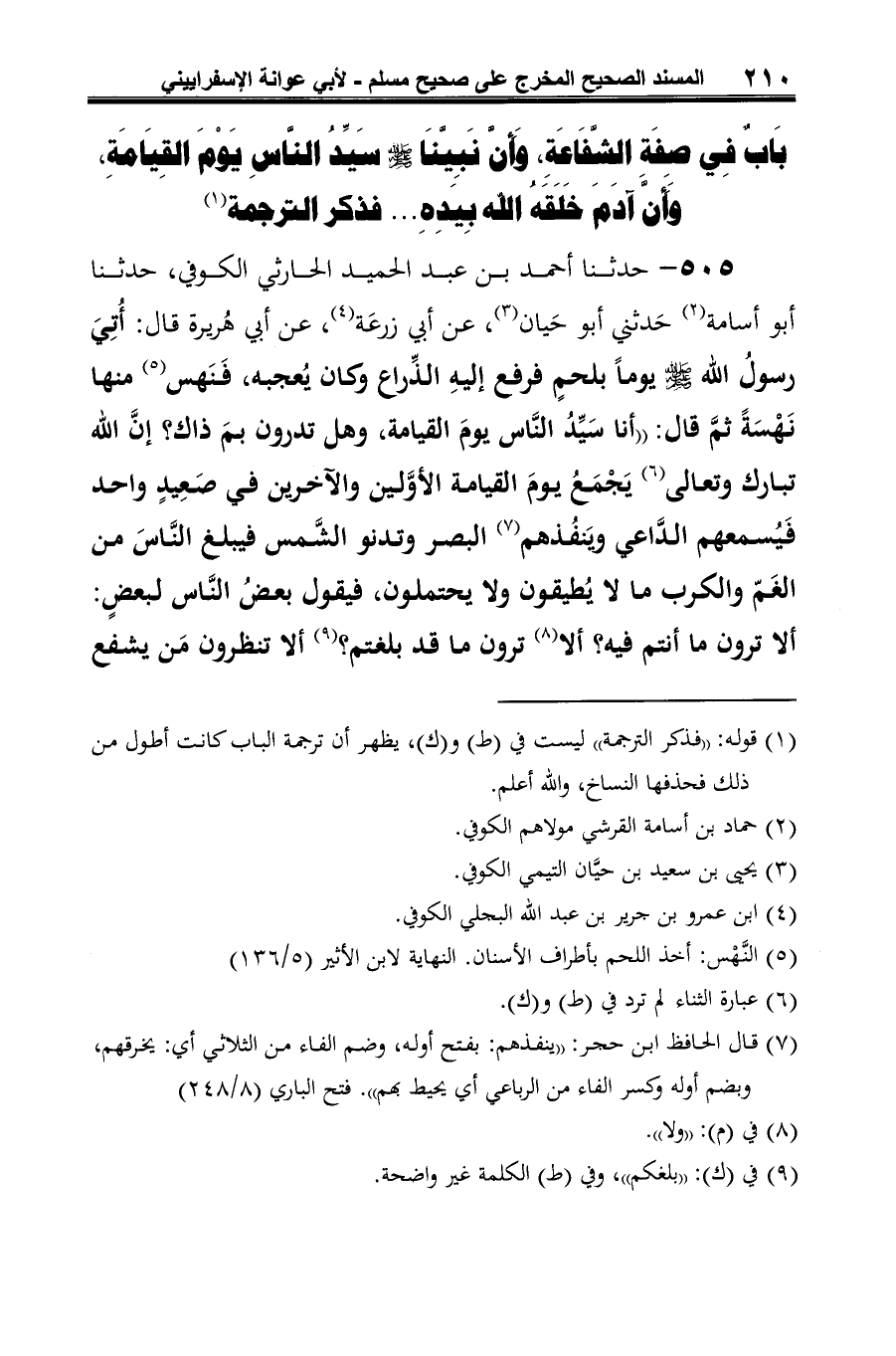 505 - حدثنا أحمد بن عبد الحميد الحارثي الكوفي، حدثنا أبو أسامة (¬1) حَدثني أبو حَيان (¬2)، عن أبي زرعَة (¬3)، عن أبي هُريرة قال: أُتِيَ رسولُ الله -صلى الله عليه وسلم- يومًا بلحمٍ فرفع إليهِ الذِّراع وكان يُعجبه، فَنَهس (¬4) منها نَهْسَةً ثمَّ قال: "أنا سَيِّدُ النَّاس يومَ القيامة، وهل تدرون بمَ ذاك؟ إنَّ الله تبارك وتعالى (¬5) يَجْمَعُ يومَ القيامة الأوَّلين والآخرين في صعِيدٍ واحد فَيُسمعهم الدَّاعي ويَنفُذهم (¬6) البصر وتدنو الشَّمس فيبلغ النَّاسَ من الغَمّ والكرب ما لا يُطيقون ولا يحتملون، فيقول بعضُ النَّاس لبعضٍ: ألا ترون ما أنتم فيه؟ ألا (¬7) ترون ما قد بلغتم؟ (¬8) ألا تنظرون مَن يشفع