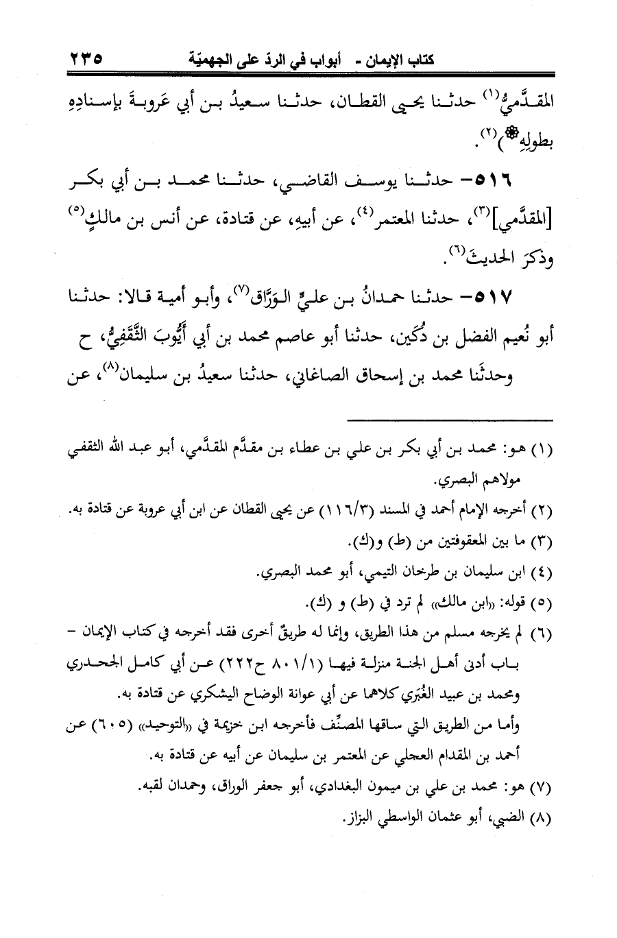 516 - حدثنا يوسف القاضي، حدثنا محمد بن أبي بكر [المقدَّمي] (¬1)، حدثنا المعتمر (¬2)، عن أبيهِ، عن قتادة، عن أنس بن مالكٍ (¬3) وذكرَ الحديثَ (¬4).