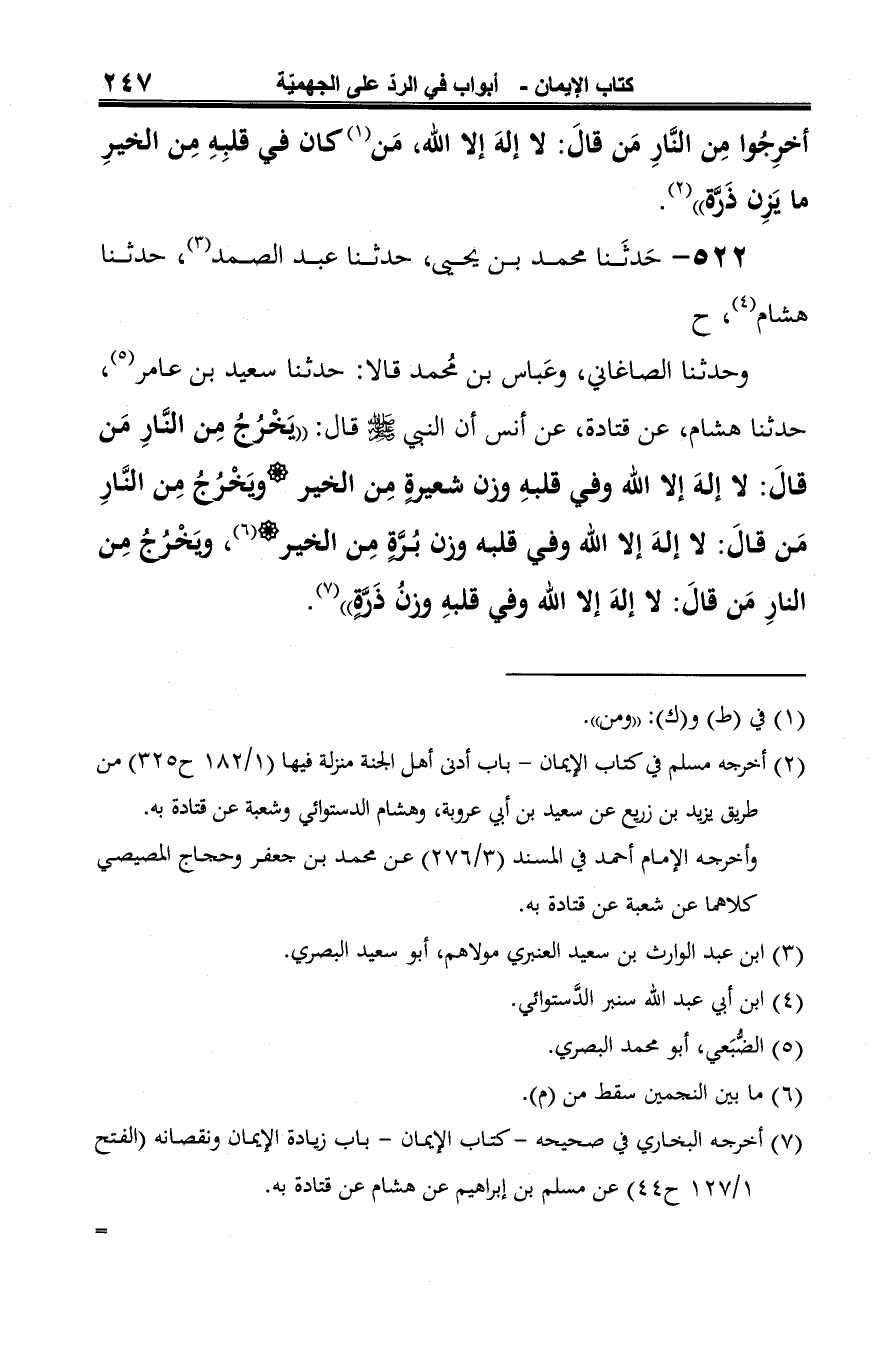 (¬5) أخرجه البخاري في صحيحه -كتاب الإيمان- باب زيادة الإيمان ونقصانه (الفتح 1/ 127 ح 44) عن مسلم بن إبراهيم عن هشام عن قتادة به. =