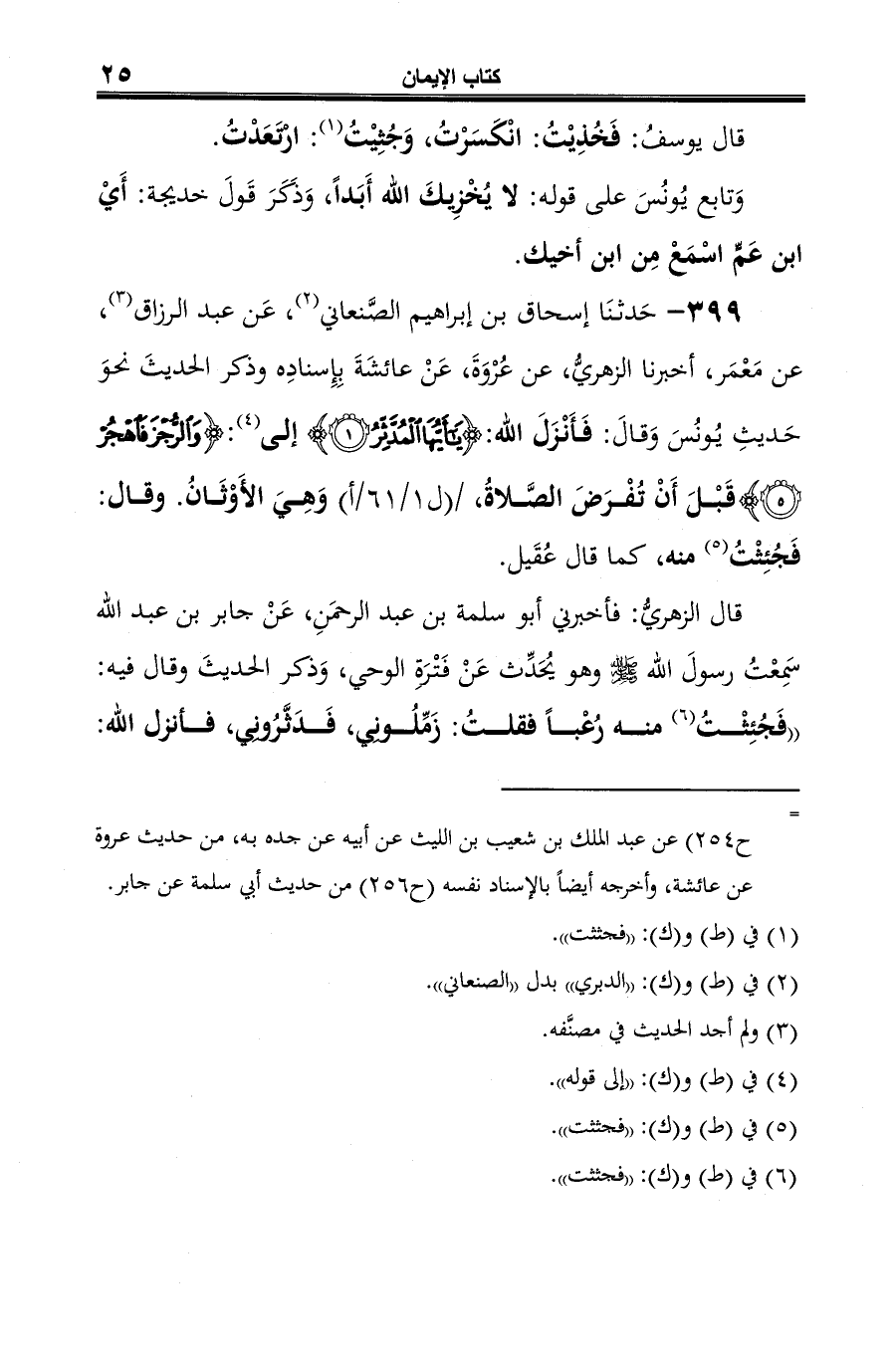 399 - حَدثنَا إسحاق بن إبراهيم الصَّنعاني (¬1)، عَن عبد الرزاق (¬2)، عن مَعْمَر، أخبرنا الزهريُّ، عن عُرْوَةَ، عَنْ عائشَةَ بِإِسنادِه وذكر الحديثَ نحوَ حَديثِ يُونُسَ وَقالَ: فَأنزَلَ الله: {يَاأَيُّهَا الْمُدَّثِّرُ (1)} إلى (¬3): {وَالرُّجْزَ فَاهْجُرْ (5)} قَبْلَ أَنْ تُفْرَض الصَّلاةُ، وَهِيَ الأَوْثَانُ. وقال: فَجُئِثْتُ (¬4) منه، كما قال عُقَيل.
