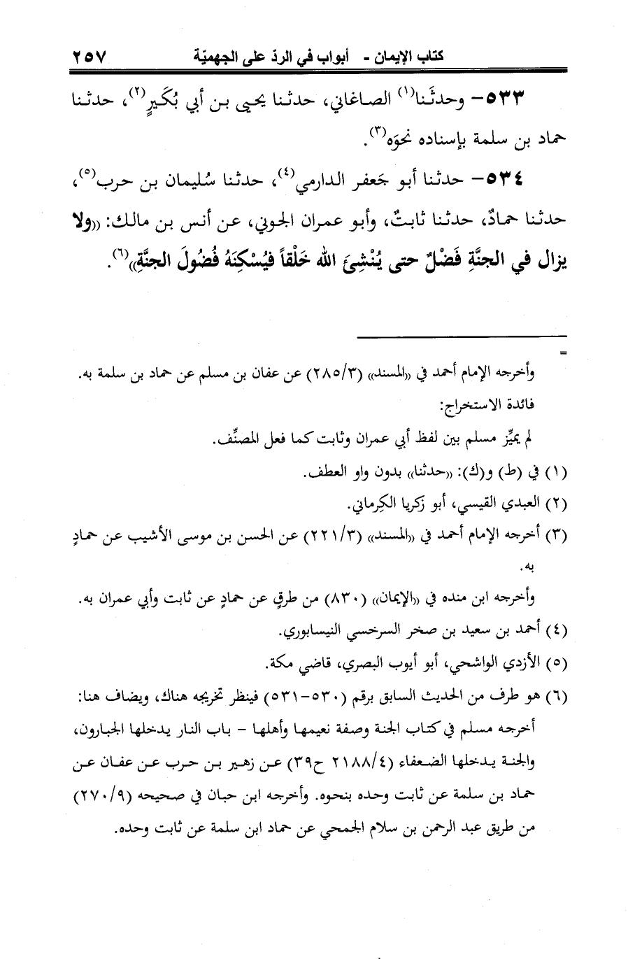 534 - حدثنا أبو جَعفر الدارمي (¬1)، حدثنا سُليمان بن حرب (¬2)، حدثنا حمادٌ، حدثنا ثابتٌ، وأبو عمران الجوني، عن أنس بن مالك: "ولا يزال في الجنَّةِ فَضْلٌ حتى يُنْشِئَ الله خَلْقًا فيُسْكِنَهُ فُضُولَ الجنَّةِ" (¬3).