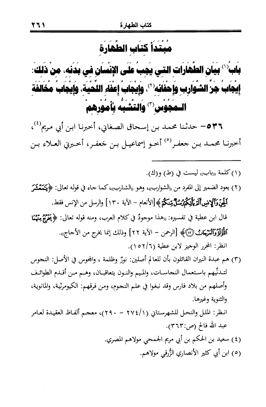 بَابُ (¬1) بَيَانِ الطَّهارَاتِ التِي يَحبُ علَى الإِنْسانِ في بدنِهِ، مِنْ ذَلِكَ: إِيجابُ جَزِّ الشوَارِبِ وإِحْفَائِهِ (¬2)، وإِيْجابُ إِعفاءِ اللِّحيَةِ، وإِيجابُ مُخَالَفَةِ المَجُوسِ (¬3) وَالتَّشبُّه بأِمُوْرِهِمْ