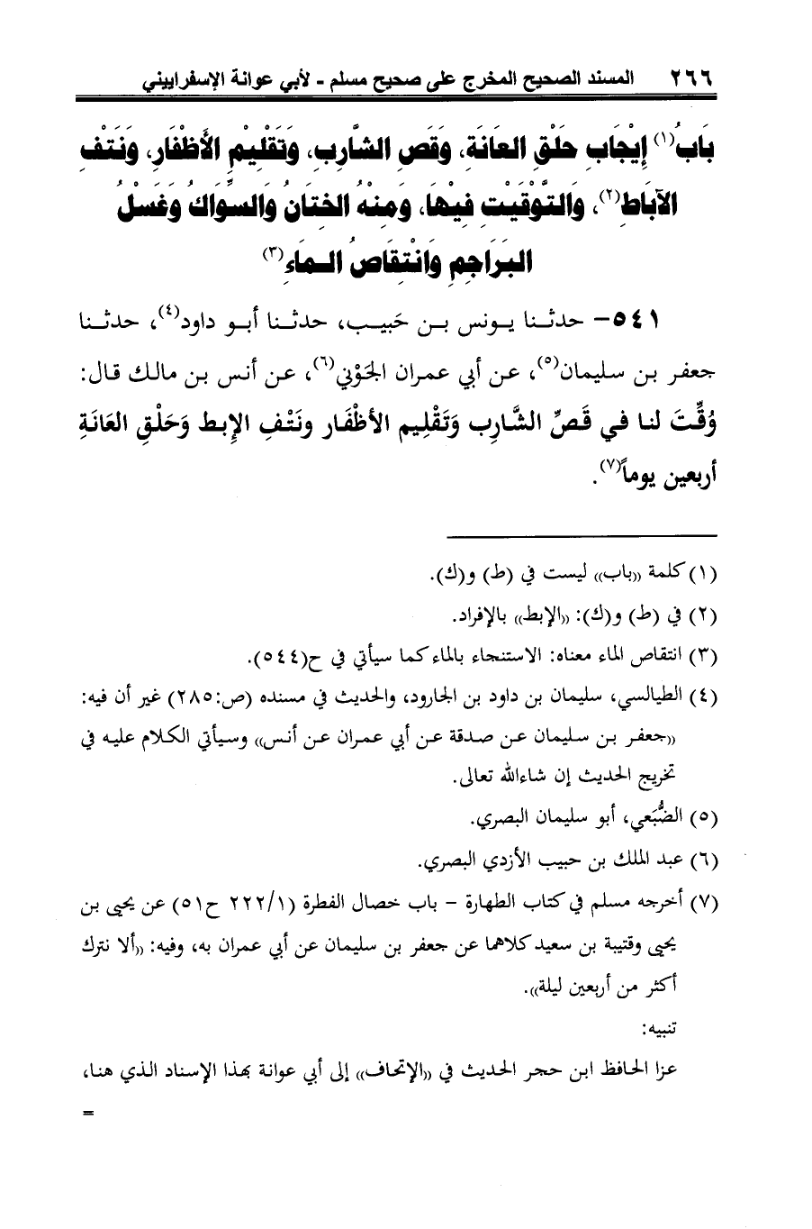 (¬4) أخرجه مسلم في كتاب الطهارة -باب خصال الفطرة (1/ 222 ح 51) عن يحيى بن يحيى وقتيبة بن سعيد كلاهما عن جعفر بن سليمان عن أبي عمران به، وفيه: "ألا نترك أكثر من أربعين ليلة".