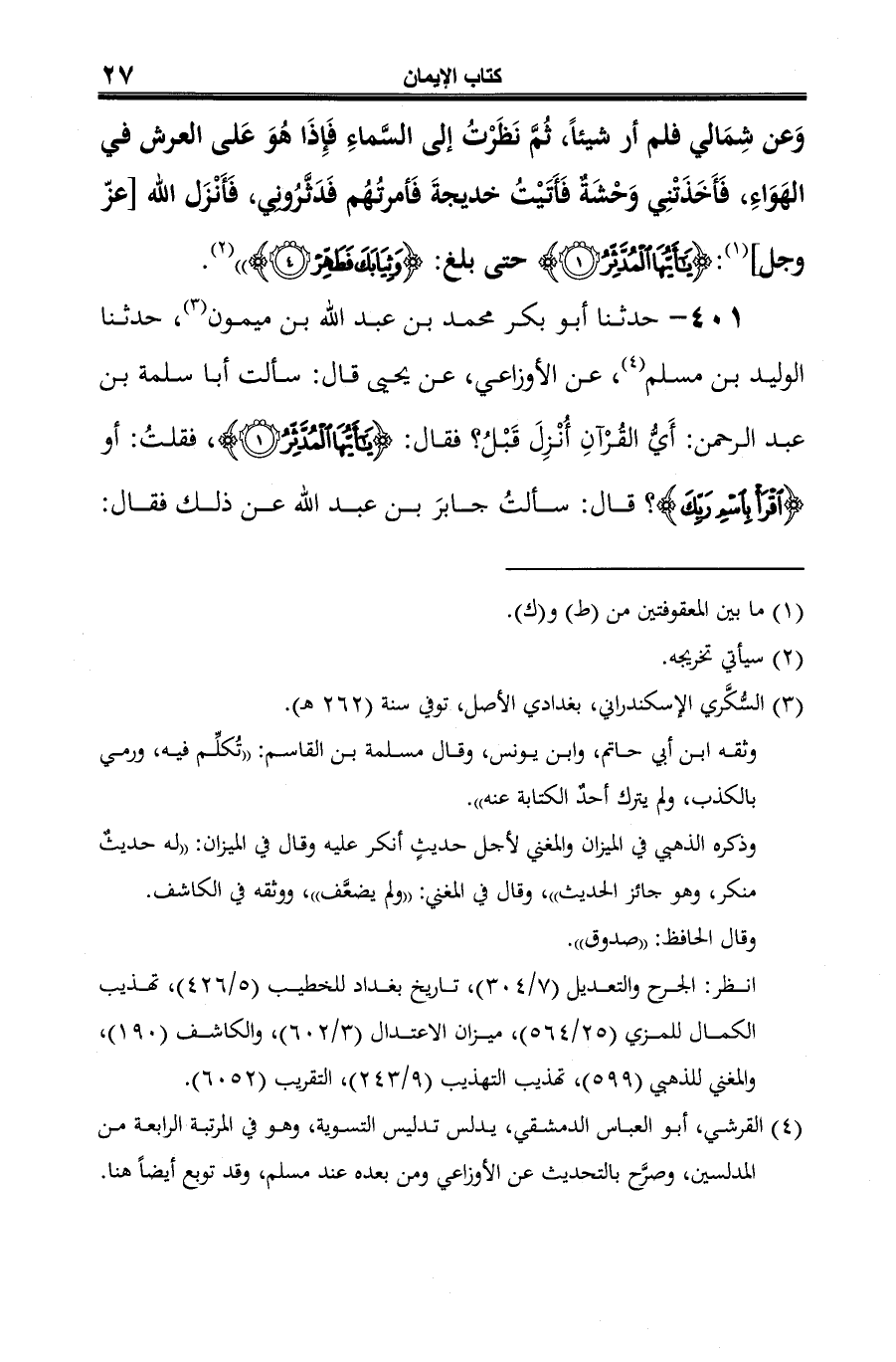401 - حدثنا أبو بكر محمد بن عبد الله بن ميمون (¬1)، حدثنا الوليد بن مسلم (¬2)، عن الأوزاعي، عن يحيى قال: سألت أبا سلمة بن عبد الرحمن: أَيُّ القُرْآنِ أُنْزِلَ قَبْلُ؟ فقال: {يَاأَيُّهَا الْمُدَّثِّرُ (1)}، فقلتُ: أو {اقْرَأْ بِاسْمِ رَبِّكَ} قال: سألتُ جابرَ بن عبد الله عن ذلك فقال:
