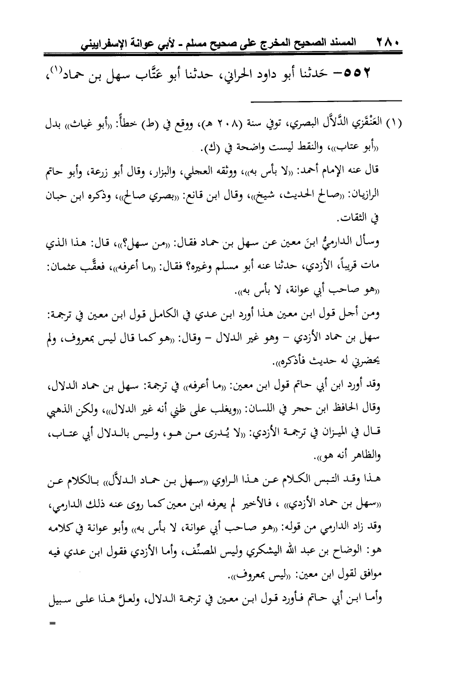 هذا وقد التبس الكلام عن هذا الراوي "سهل بن حماد الدلَّال" بالكلام عن "سهل بن حماد الأزدي"، فالأخير لم يعرفه ابن معين كما روى عنه ذلك الدارمي، وقد زاد الدارمي من قوله: "هو صاحب أبي عوانة، لا بأس به" وأبو عوانة في كلامه هو: الوضاح بن عبد الله اليشكري وليس المصنِّف، وأما الأزدي فقول ابن عدي فيه موافق لقول ابن معين: "ليس بمعروف".