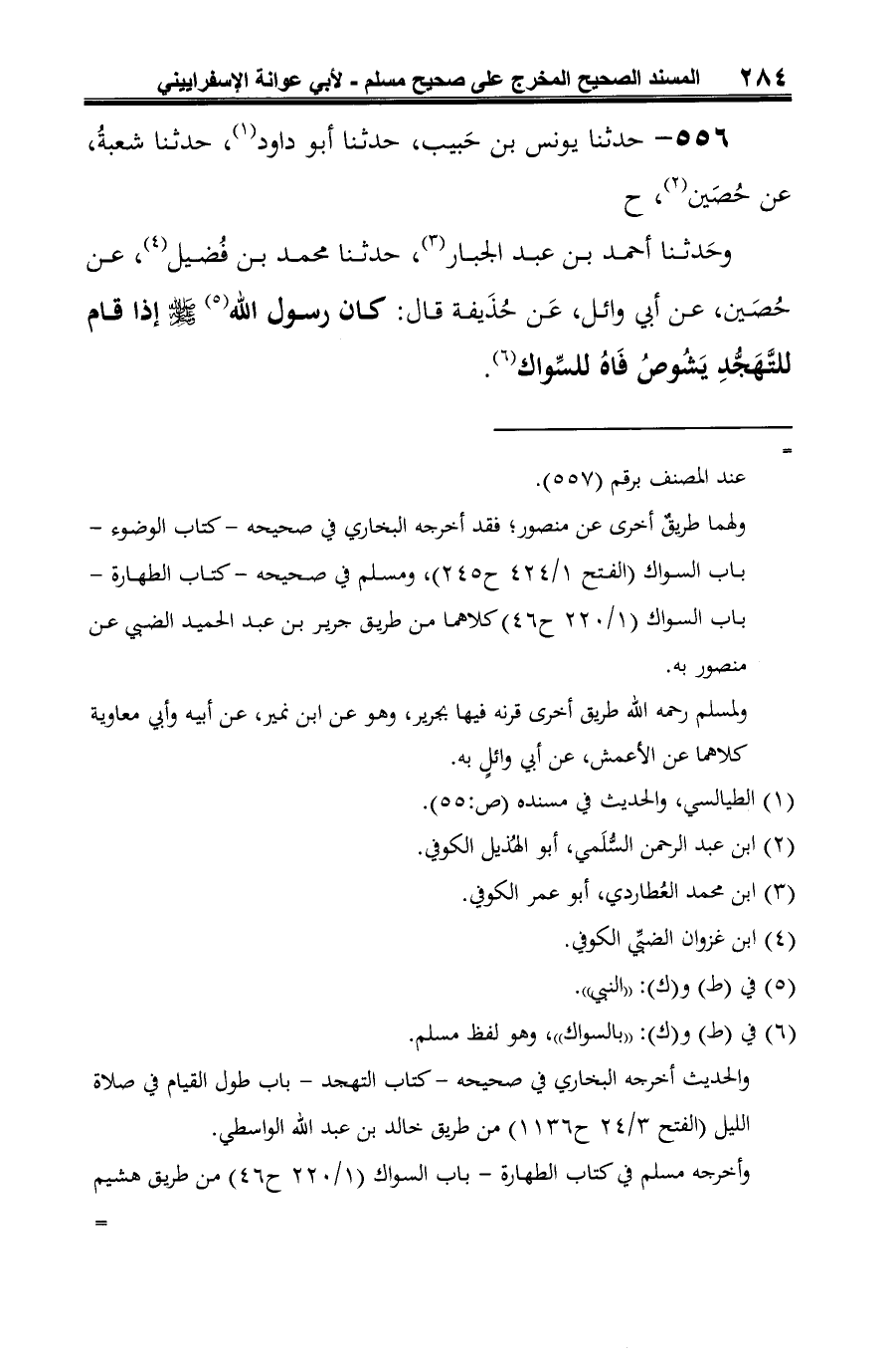 وأخرجه الدارمي في السنن -كتاب الطهارة- باب السواك عند التهجد (1/ 185 ح 685) عن سعيد بن الربيع عن شعبة عن حُصينٍ به.