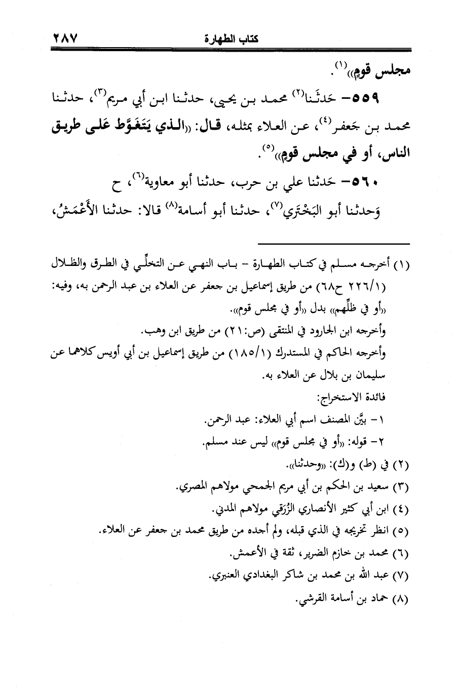 559 - حَدثَنا (¬1) محمد بن يحيى، حدثنا ابن أبي مريم (¬2)، حدثنا محمد بن جَعفر (¬3)، عن العلاء بمثله، قال: "الذي يتغَوَّط علَى طريق الناس، أو في مجلس قومٍ" (¬4).