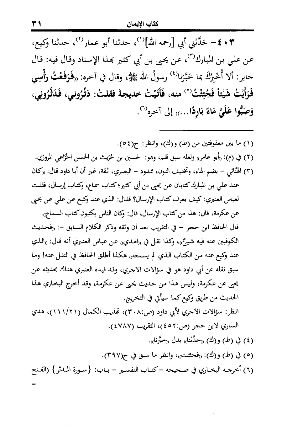 403 - حَدَّثني أبي [رحمه الله] (¬1)، حدثنا أبو عمار (¬2)، حدثنا وكيع، عن علي بن المبارك (¬3)، عن يحيى بن أبي كثير بهذا الإسناد وقال فيه: قال جابر: ألا أُخْبِرُكَ بما خَبَّرَنا (¬4) رسولُ الله -صلى الله عليه وسلم-، وقال في آخره: "فَرَفَعْتُ رَأْسِي فَرَأَيْتُ شَيْئًا فَجُئِثْتُ (¬5) منه، فَأَتَيْتُ خديجةَ فقلتُ: دَثِّرُوني، فَدَثَّرُوني، وَصَبُّوا عَلَيَّ مَاءً بَارِدًا ... " إلى آخره (¬6).