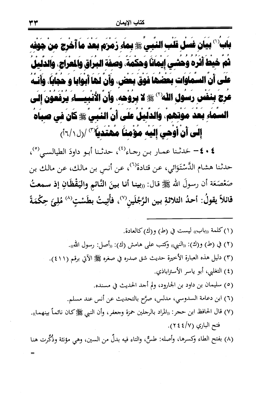 بَابُ (¬1) بَيَان غسل قَلْبِ النبيِّ -صلى الله عليه وسلم- بِمَاءِ زَمْزَم بَعْد مَا أخْرِجَ مِنْ جوْفِهِ ثُم خِيط أثَرُهُ وحُشِيَ إِيْمَانًا وَحِكْمَةً، وَصِفَةِ البُرَاقِ والمِعْرَاجِ، والدَّليلُ علَى أن السماواتِ بَعضها فَوق بَعض، وأن لَها أبْوَابا وَحجابًا، وأنهُ عُرِجَ بِنَفسِ رسولِ الله (¬2) -صلى الله عليه وسلم- لا بِرُوْحِهِ، وأن الأَنْبيَاءَ يُرْفَعوْنَ إِلى السمَاءِ بَعْدَ مَوْتِهمْ، وَالدلِيْلُ علَى أن النبي -صلى الله عليه وسلم- كانَ في صبَاهُ إِلى أن أوْحِيَ إِلَيْهِ مُؤْمنًا مؤمنا مهتديًا (¬3)
