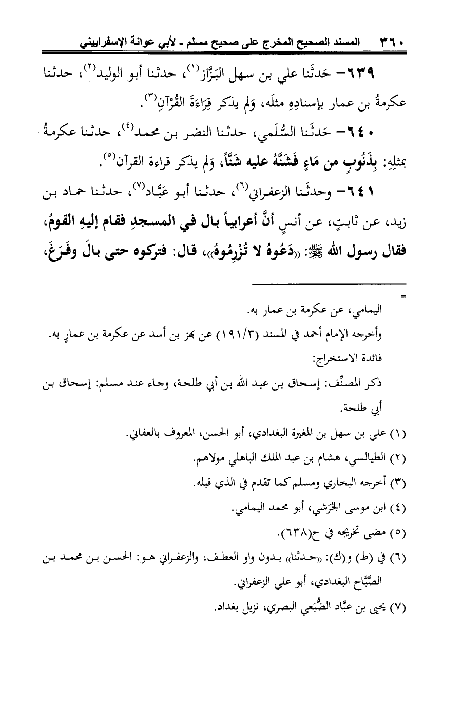 641 - وحدثَنا الزعفراني (¬1)، حدثنا أبو عَبَّاد (¬2)، حدثنا حماد بن زيد، عن ثابتٍ، عن أنسٍ أنَّ أعرابيًّا بال في المسجدِ فقام إلىهِ القومُ، فقال رسول الله -صلى الله عليه وسلم-: "دَعُوهُ لا تُزْرِمُوهُ"، قال: فتركوه حتى بالَ وفَرَغَ،