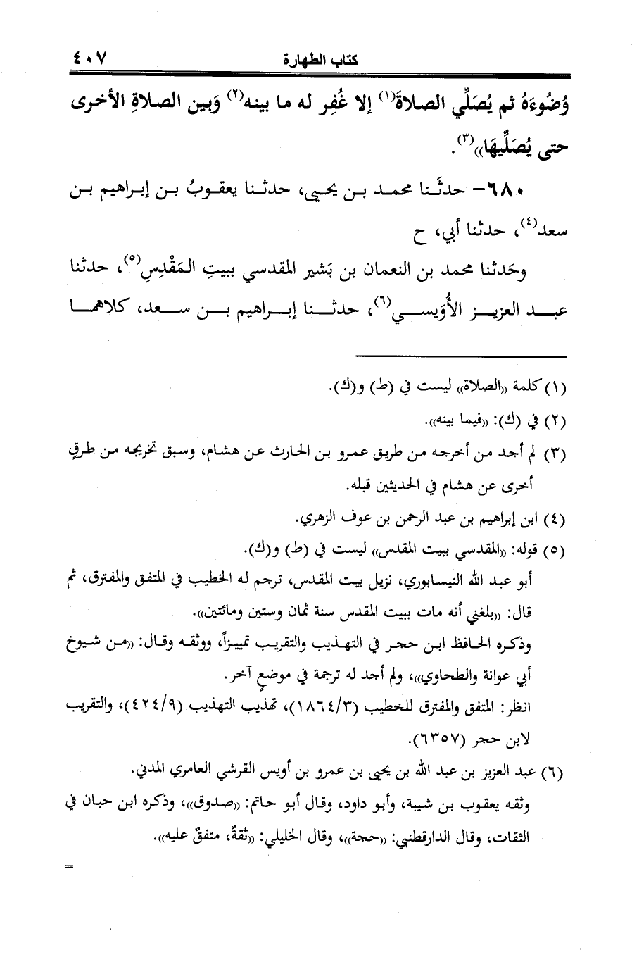 (¬4) قوله: "كلاهما" ليس في (ط) و (ك)، وفي جميع النسخ "قالا" وينبغي أن يعبَّر بـ "قال" لأنّ القائل هو: إبراهيم بن سعد، ولعلّ المراد أن يعقوب بن سعد وعبد العزيز الأويسي كلاهما قالا في روايتهما عن إبراهيم بن سعد عن صالح، والله أعلم.