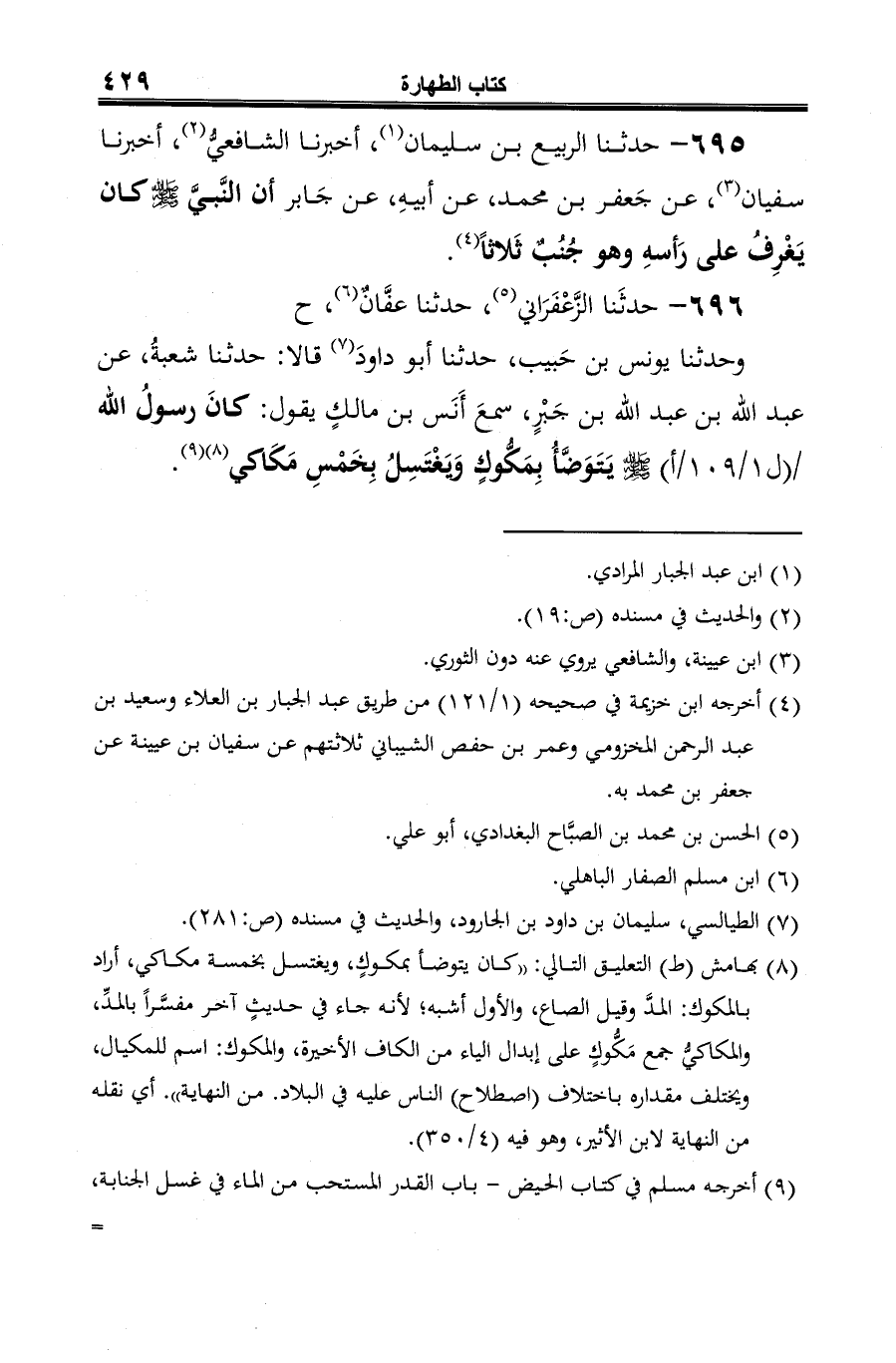(¬4) بهامش (ط) التعليق التالي: "كان يتوضأ بمكوكٍ، ويغتسل بخمسة مكاكي، أراد بالمكوك: المدَّ وقيل الصاع، والأول أشبه؛ لأنه جاء في حديثٍ آخر مفسَّرًا بالمدِّ، والمكاكيُّ جمع مَكُّوكٍ على إبدال الياء من الكاف الأخيرة، والمكوك: اسم للمكيال، ويختلف مقداره باختلاف (اصطلاح) النَّاس عليه في البلاد. من النهاية". أي نقله من النهاية لابن الأثير، وهو فيه (4/ 350).