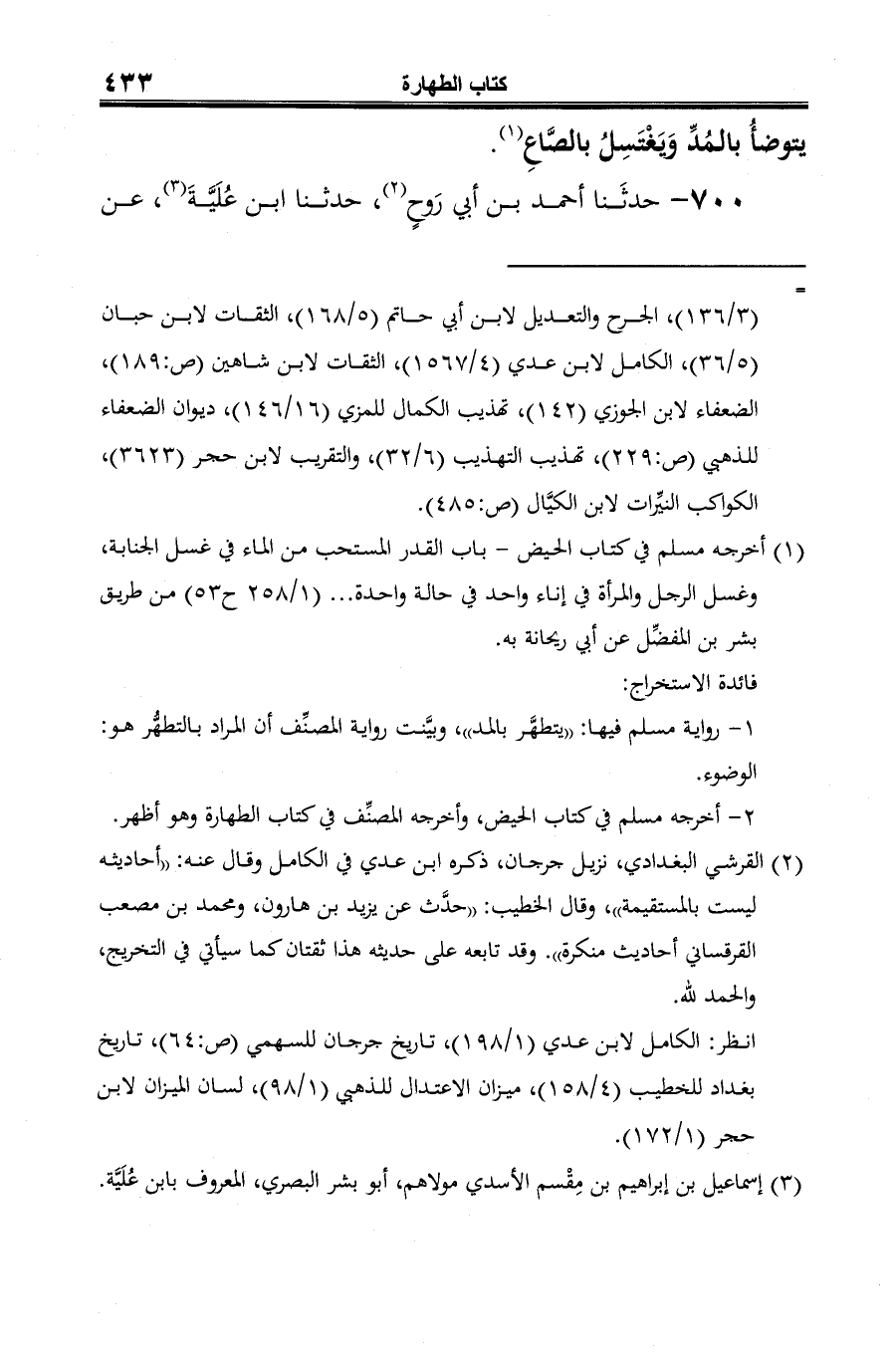(¬3) أخرجه مسلم في كتاب الحيض -باب القدر المستحب من الماء في غسل الجنابة، وغسل الرَّجل والمرأة في إناء واحد في حالة واحدة ... (1/ 258 ح 53) عن أبى بكر بن أبي شيبة، وعلي بن حجر كلاهما عن ابن عُليَّة عن أبي ريحانة به، وقال عقب الحديث: "وفي حديث ابن حجر أو قال: يطهِّره المُدُّ، وقال: وقد كان كَبِر وما كنت أثق بحديثه".