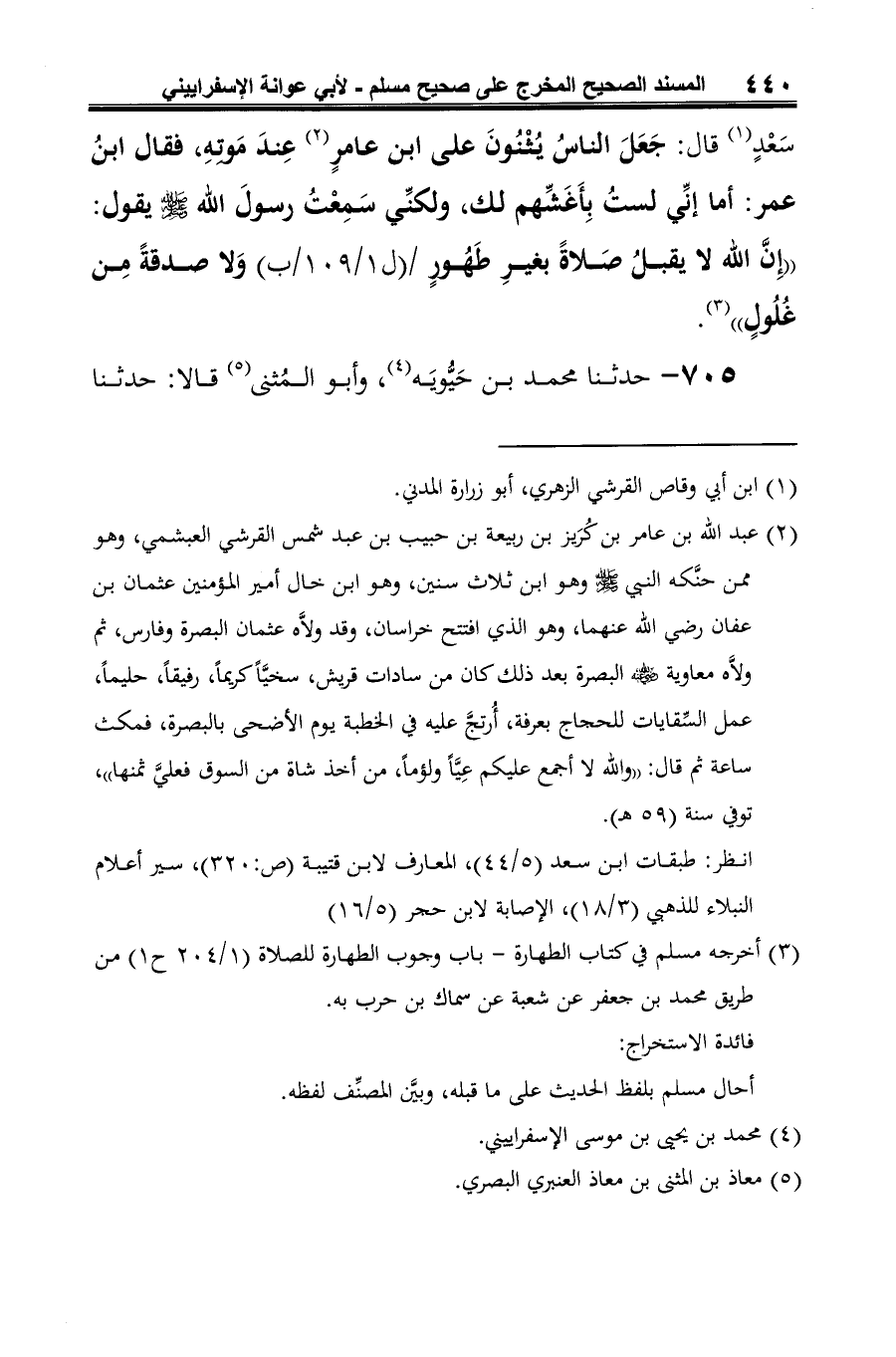 -[441]- أبو الوليد (¬3)، حدّثنا زائدةُ (¬4)، وأبو عَوانة (¬5)، عن سَماكٍ، عن مُصْعَب بن سعدٍ، عن ابن عُمَرَ أَن النَّبيَّ -صلى الله عليه وسلم- قال: "لا يَقْبَلُ الله صدقةً مِن غُلُولٍ، ولا يَقبلُ صَلاةً (¬6) بغيرِ طَهُورٍ" (¬7).