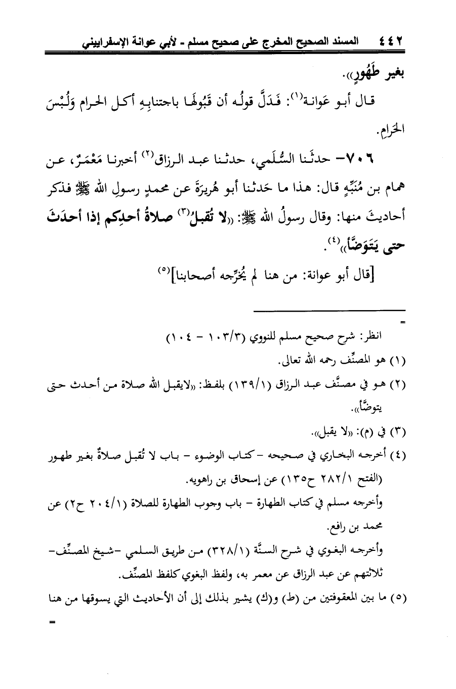 706 - حدثَنا السُّلَمي، حدّثنا عبد الرزّاق (¬1) أخبرنا مَعْمَرٌ، عن همام بن مُنَبِّهٍ قال: هذا ما حَدثنا أبو هُريرَةَ عن محمدٍ رسولِ الله -صلى الله عليه وسلم- فذكر أحاديثَ منها: وقال رسولُ الله -صلى الله عليه وسلم-: "لا تُقْبَلُ (¬2) صلاةُ أحدِكم إذا أَحْدَثَ حتَّى يَتَوَضَّأ" (¬3).