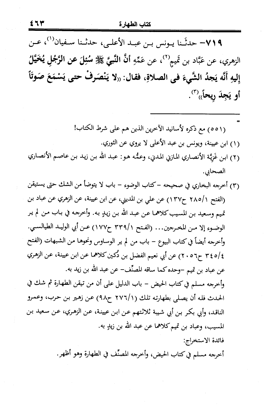 719 - حدثَنا يونس بن عبد الأعلى، حدّثنا سفيان (¬1)، عن الزّهريِّ، عن عَبَّاد بن تَميمٍ (¬2)، عن عَمِّهِ أنَّ النبيَّ -صلى الله عليه وسلم- سُئِلَ عن الرَّجُلِ يُخَيَّلُ إِليهِ أَنَّه يَجدُ الشَّيءَ في الصّلاةِ، فقال: "لا يَنْصَرفْ حتّى يَسْمَعَ صَوتًا أو يَجِدَ رِيحًا" (¬3).