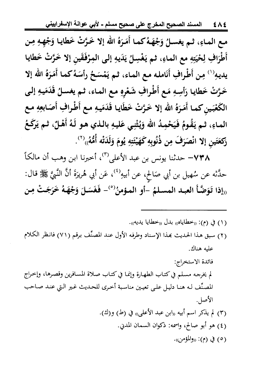 738 - حدّثنا يونس بن عبد الأعلى (¬1)، أخبرنا ابن وهب أن مالكًا حدَّثه عن سُهيل بن أبي صَالحٍ، عن أبيهِ (¬2)، عَن أبي هُريرَةَ أنَّ النبَّيَّ -صلى الله عليه وسلم- قال: "إِذا تَوَضَّأَ العبد المسلمُ -أو المؤمنُ (¬3) - فَغَسَلَ وَجْهَهُ خَرَجَتْ مِن