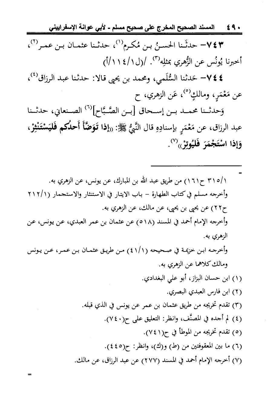 وَحدثنا محمّد بن إسحاق [بن الصَّبَّاح] (¬3) الصنعاني، حدّثنا عبد الرزّاق، عن مَعْمَرٍ بإسنادِهِ قال النَّبيُّ -صلى الله عليه وسلم-: "إذا تَوَضَّأَ أَحدُكم فَليَسْتَنْثِرْ، وَإذا اسْتَجْمَرَ فَليُوتِرْ" (¬4).