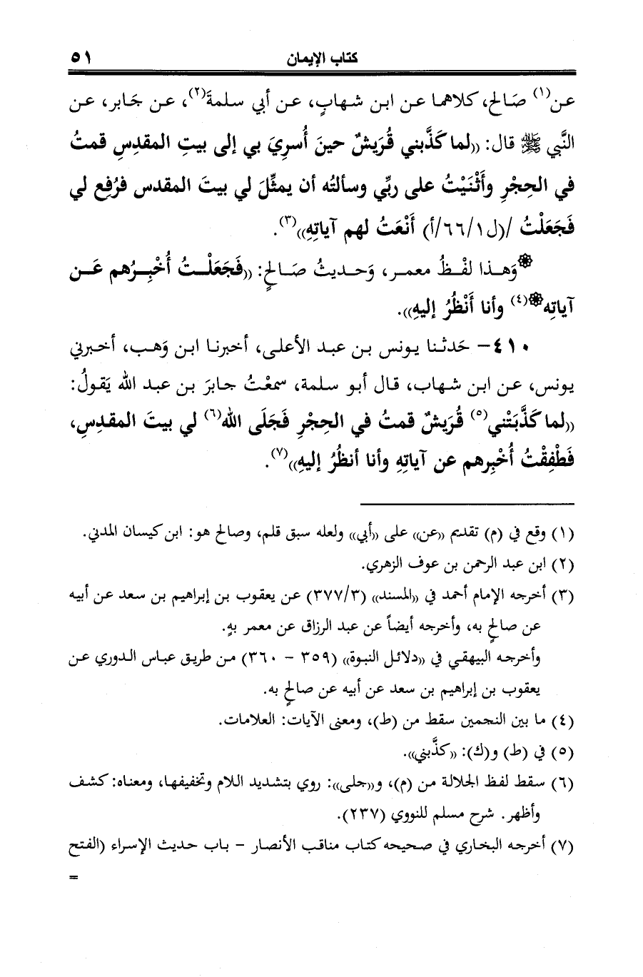 410 - حَدثنا يونس بن عبد الأعلى، أخبرنا ابن وَهب، أخبرني يونس، عن ابن شهاب، قال أبو سلمة، سمعْتُ جابرَ بن عبد الله يَقولُ: "لما كَذَّبَتْني (¬1) قُرَيشٌ قمتُ في الحِجْرِ فَجَلَى الله (¬2) لي بيتَ المقدِسِ، فَطْفِقْتُ أُخْبِرهم عن آياتِهِ وأنا أنظُرُ إليهِ" (¬3).