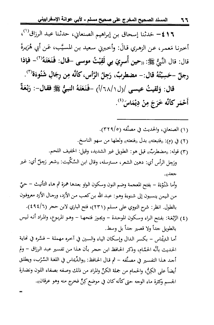 416 - حَدثنا إسحاق بن إبراهيم الصنعاني، حدثنا عبد الرزاق (¬1)، أخبرنا مَعمر، عن الزهريّ قالَ: وأخبرني سعيد بن المسيَّب، عَن أبي هُرَيرةَ قال: قال النَّبيُّ -صلى الله عليه وسلم-: "حين أُسرِيَ بي لَقِيْتُ موسى -قال: فَنَعَتَهُ (¬2) - فإذا رجلٌ -حَسِبْتُهُ قال: - مضطربٌ، رَجِلُ الرَّأس، كأنَّه مِن رِجَالِ شَنُوءَة (¬3).