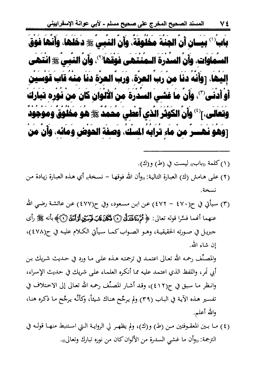 (¬4) ما بين المعقوفتين من (ط) و (ك)، ولم يظهر في الرواية التي استنبط منها قوله في الترجمة: "وأن ما غشي السدرة من الألوان كان من نوره تبارك وتعالى".