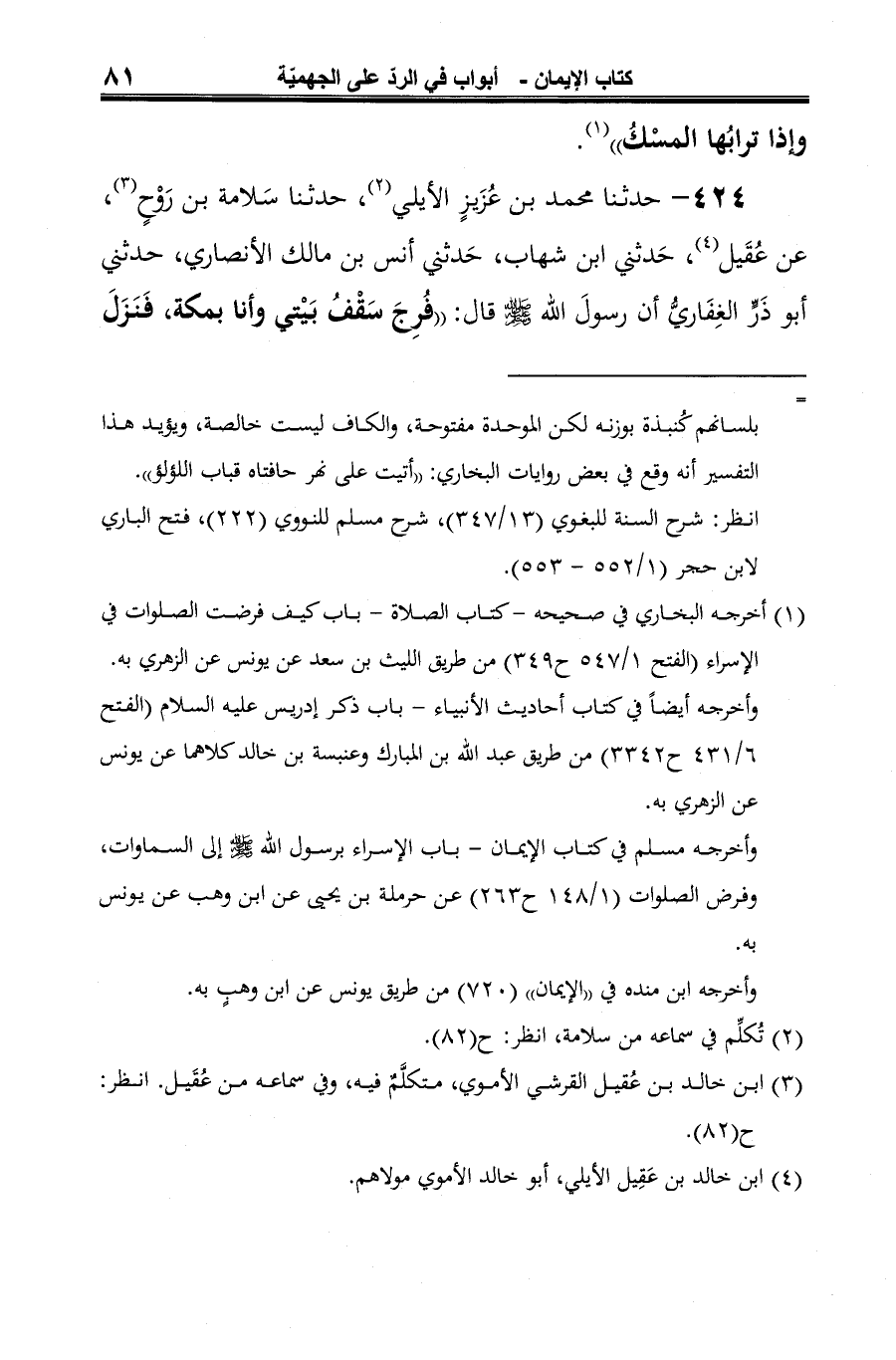 424 - حدثنا محمد بن عُزَيزٍ الأيلي (¬1)، حدثنا سَلامة بن رَوْحٍ (¬2)، عن عُقَيل (¬3)، حَدثني ابن شهاب، حَدثني أنس بن مالك الأنصاري، حدثني أبو ذَرٍّ الغِفَاريُّ أن رسولَ الله -صلى الله عليه وسلم- قال: "فُرِجَ سَقْفُ بَيْتي وأنا بمكة، فَنَزَلَ