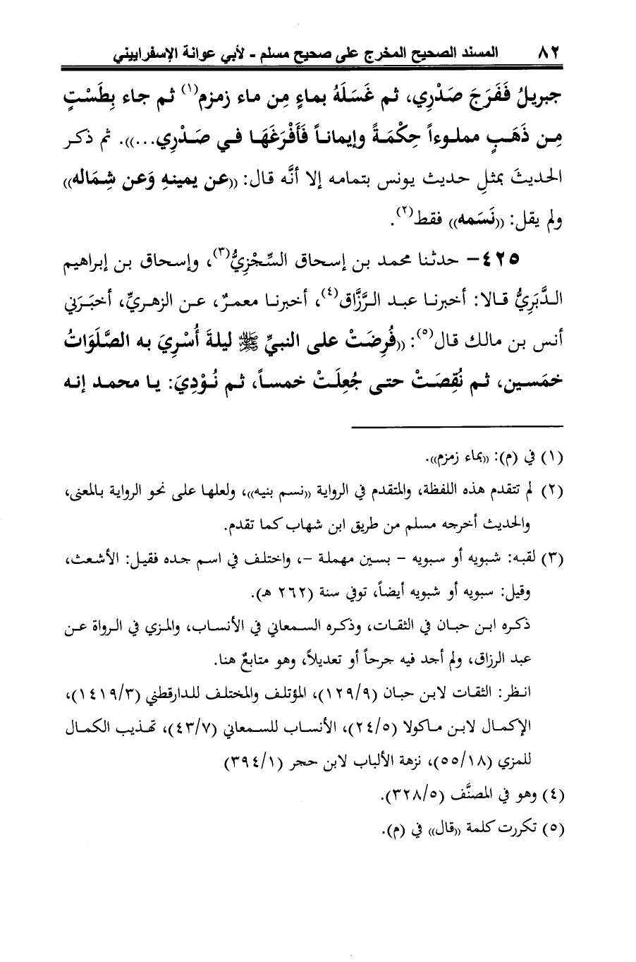 425 - حدثنا محمد بن إسحاق السِّجْزِيُّ (¬1)، وإسحاق بن إبراهيم الدَّبَرِىُّ قالا: أخبرنا عبد الرَّزَّاق (¬2)، أخبرنا معمرٌ، عن الزهريِّ، أخبَرَني أنس بن مالك قال (¬3): "فُرِضَتْ على النبيِّ -صلى الله عليه وسلم- ليلةَ أُسْرِيَ به الصَّلَوَاتُ خمَسين، ثم نُقِصَتْ حتى جُعِلَتْ خمسًا، ثم نُوْدِيَ: يا محمد إنه