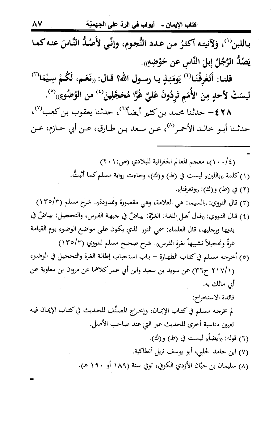 1 - لم يخرجه مسلم في كتاب الإيمان، وإخراج المصنِّف للحديث في كتاب الإيمان فيه تعيين مناسبة أخرى للحديث غير التي عند صاحب الأصل.