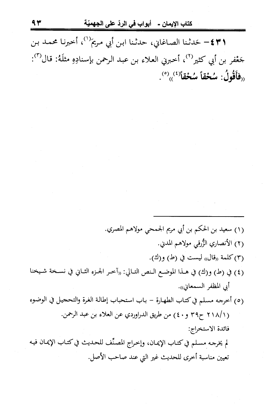 431 - حَدثنا الصاغاني، حدثنا ابن أبي مريمَ (¬1)، أخبرنا محمد بن جَعْفر بن أبي كثير (¬2)، أخبرني العلاء بن عبد الرحمن بإسنادِهِ مثلَهُ: قال (¬3): "فأَقُولُ: سُحْقًا سُحْقًا (¬4) (¬5).