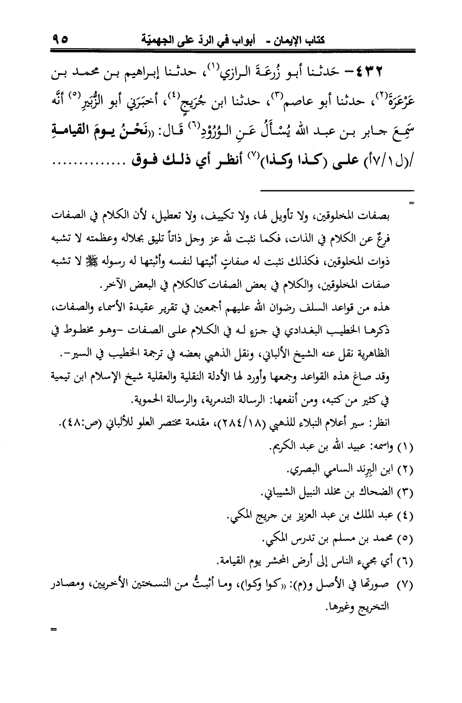 432 - حَدثنا أبو زُرعَةَ الرازي (¬1)، حدثنا إبراهيم بن محمد بن عَرْعَرَةَ (¬2)، حدثنا أبو عاصم (¬3)، حدثنا ابن جُرَيجٍ (¬4)، أخبَرَني أبو الزُّبَيرِ (¬5) أنَّه سمِعَ جابر بن عبد الله يُسْأَلُ عَنِ الوُرُوْدِ (¬6) قَال: "نَحْنُ يومَ القيامةِ على (كذا وكذا) (¬7) أنظر أي ذلك فوق