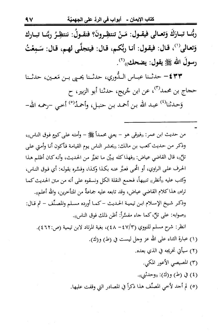 -[101]- = نصَّ -أي: الإمام أحمد- على صحة هذه الأحاديث والأخذ بظاهرها والإنكار على من فسَّرها".