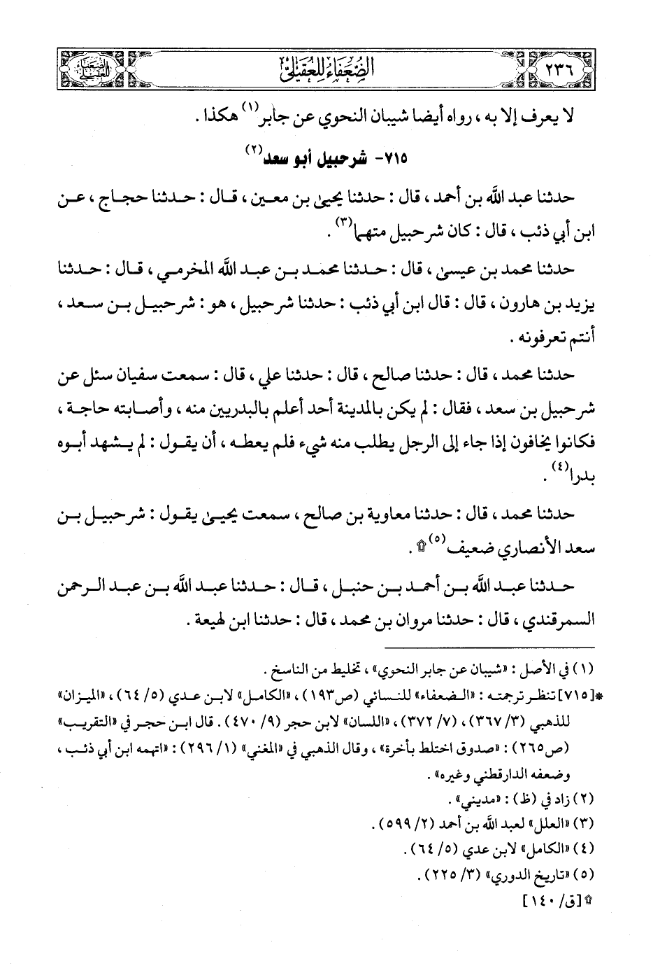 حدثنا عبد الله بن أحمد، قال: حدثنا يحيى بن معين، قال: حدثنا حجاج، عن ابن أبي ذئب، قال: كان شرحبيل متهما (4).
