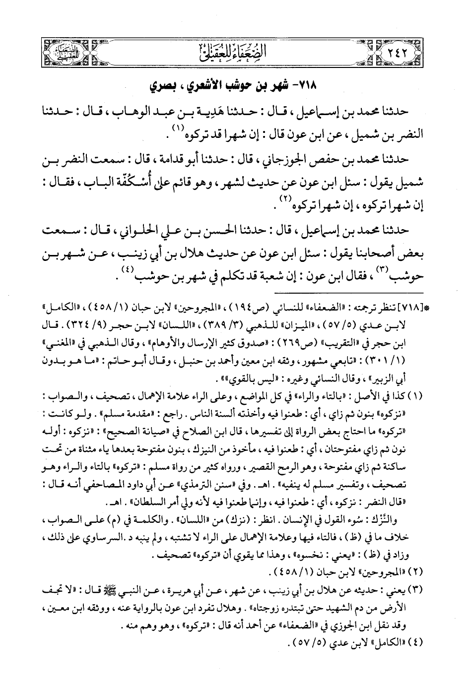 حدثنا محمد بن حفص الجوزجاني، قال: حدثنا أبو قدامة، قال: سمعت النضر بن شميل يقول: سئل ابن عون عن حديث لشهر، وهو قائم على أُسْكُفّة الباب، فقال: إن شهرا تركوه، إن شهرا تركوه (3).