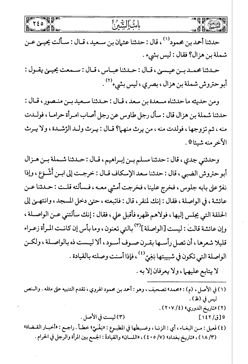 وحدثني جدي، قال: حدثنا مسلم بن إبراهيم، قال: حدثنا شملة بن هزال أبو حتروش الضبي، قال: حدثنا سعد الإسكاف قال: خرجت إلى ابن أَشْوَع، وإذا نفرٌ على بابه جلوس، فخرج علينا، فخرجت أمشي معه، فسألته قلت: حدثنا عن عائشة، في الواصلة، فقال: إنك لمنقر، قال: فاتبعته، حتى دخل المسجد، وانتهى إلى الحلقة التي يجلس إليها، فولاهم ظهره فأقبل علي، فقال: إنك سألتني عن الواصلة، وإن عائشة قالت: ليست [الواصلة] (4) بالتي تعنون، وما بأس إن كانت المرأة زعراء قليلا شعرها، أن تصل رأسها بقرن صوف أسود، ألا ليست ذه بالواصلة، ولكن الواصلة التي تكون في شبيبتها بَغِيّ (5)، فإذا أسنت وصلته بالقيادة.