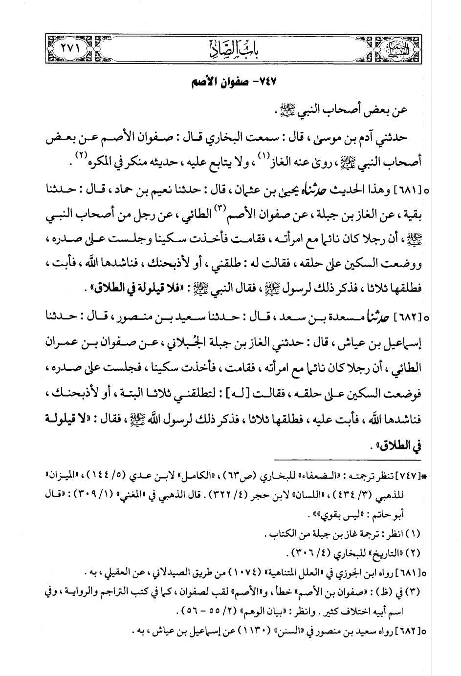 [681] (4) وهذا الحديث حدثناه يحيى بن عثمان، قال: حدثنا نعيم بن حماد، قال: حدثنا بقية، عن الغاز بن جبلة، عن صفوان الأصم (5) الطائي، عن رجل من أصحاب النبي صلى الله عليه وسلمع، أن رجلا كان نائما مع امرأته، فقامت فأخذت سكينا وجلست على صدره، ووضعت السكين على حلقه، فقالت له: طلقني، أو لأذبحنك، فناشدها الله، فأبت، فطلقها ثلاثا، فذكر ذلك لرسول صلى الله عليه وسلمع، فقال النبي صلى الله عليه وسلمع: «فلا قيلولة في الطلاق».