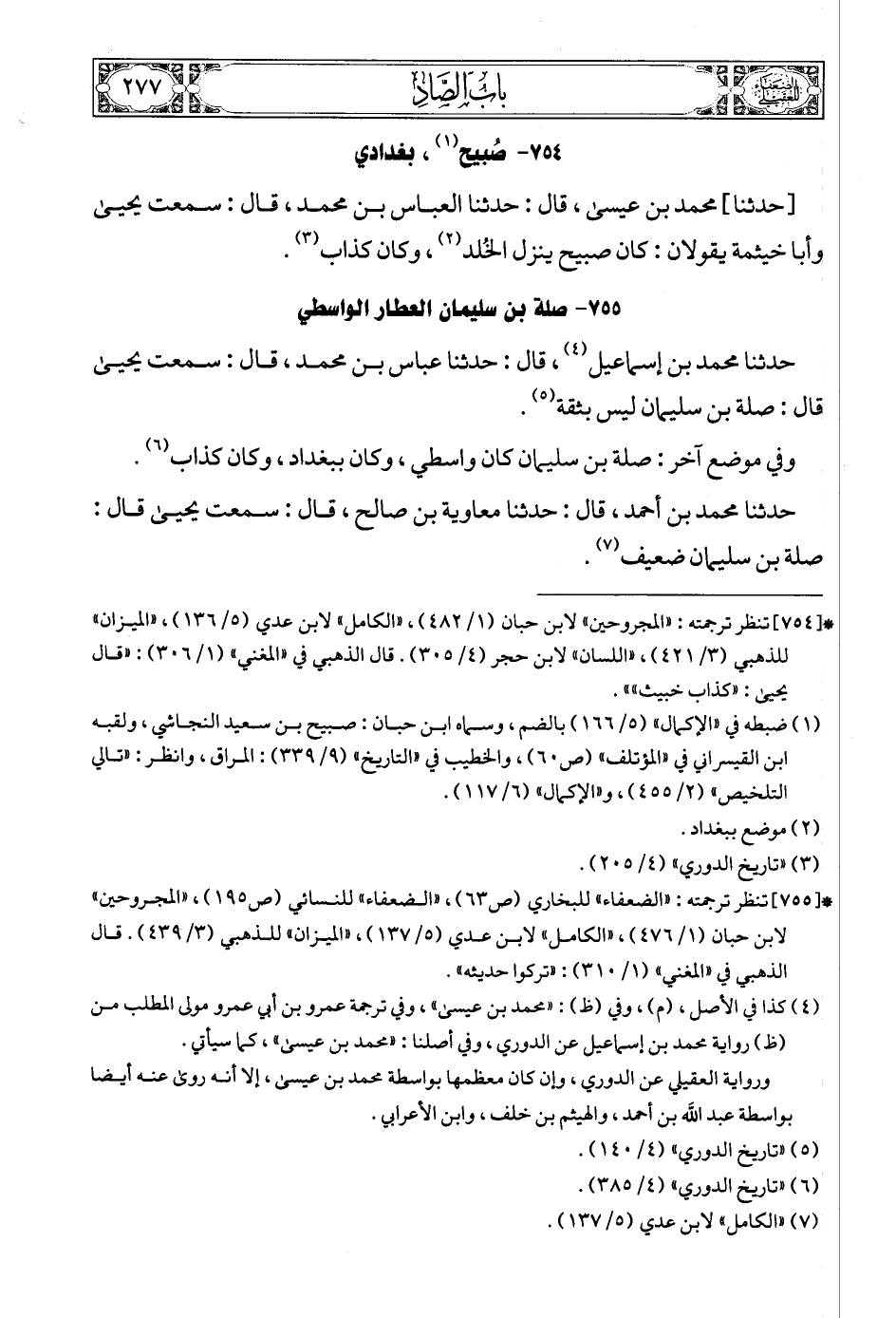 [حدثنا] محمد بن عيسى، قال: حدثنا العباس بن محمد، قال: سمعت يحيى وأبا خيثمة يقولان: كان صبيح ينزل الخُلد (3)، وكان كذاب (4).