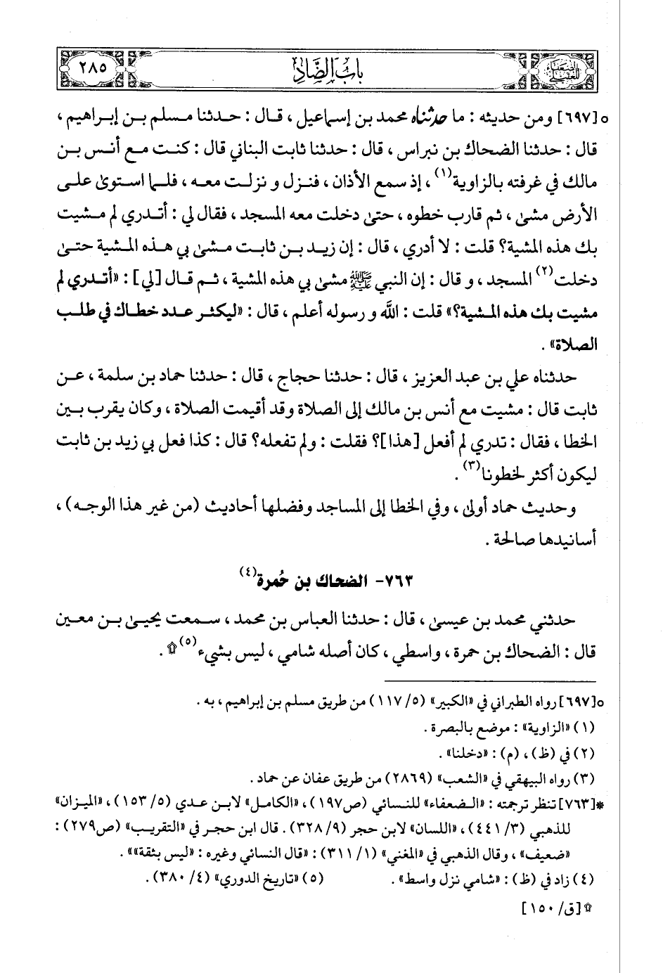 [697] (1) ومن حديثه: ما حدثناه محمد بن إسماعيل، قال: حدثنا مسلم بن إبراهيم، قال: حدثنا الضحاك بن نبراس، قال: حدثنا ثابت البناني قال: كنت مع أنس بن مالك في غرفته بالزاوية (2)، إذ سمع الأذان، فنزل و نزلت معه، فلما استوى على الأرض مشى، ثم قارب خطوه، حتى دخلت معه المسجد، فقال لي: أتدري لم مشيت بك هذه المشية؟ قلت: لا أدري، قال: إن زيد بن ثابت مشى بي هذه المشية حتى دخلت (3) المسجد، و قال: إن النبي صلى الله عليه وسلمع مشى بي هذه المشية، ثم قال [لي]: «أتدري لم مشيت بك هذه المشية؟» قلت: الله و رسوله أعلم، قال: «ليكثر عدد خطاك في طلب الصلاة».