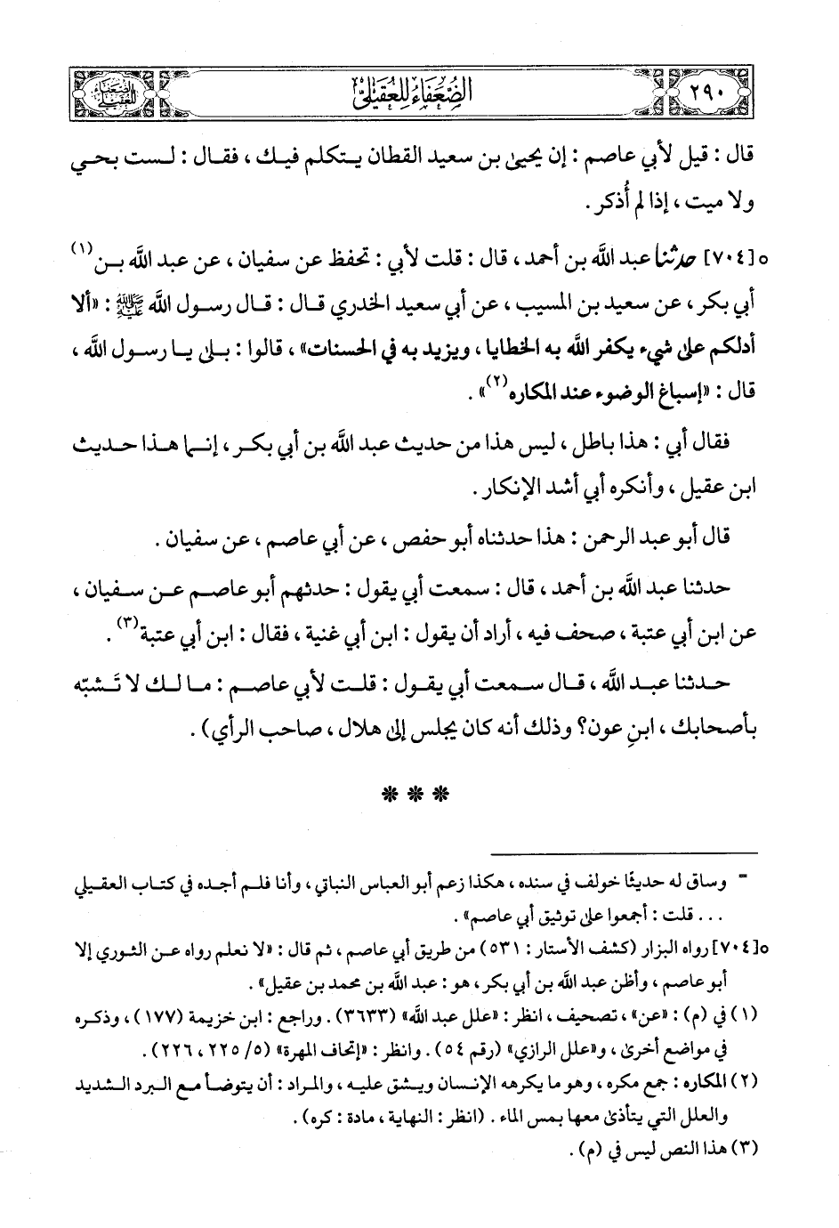 [704] (1) حدثنا عبد الله بن أحمد، قال: قلت لأبي: تحفظ عن سفيان، عن عبد الله بن (2) أبي بكر، عن سعيد بن المسيب، عن أبي سعيد الخدري قال: قال رسول الله صلى الله عليه وسلمع: «ألا أدلكم على شيء يكفر الله به الخطايا، ويزيد به في الحسنات»، قالوا: بلى يا رسول الله، قال: «إسباغ الوضوء عند المكاره (3)».