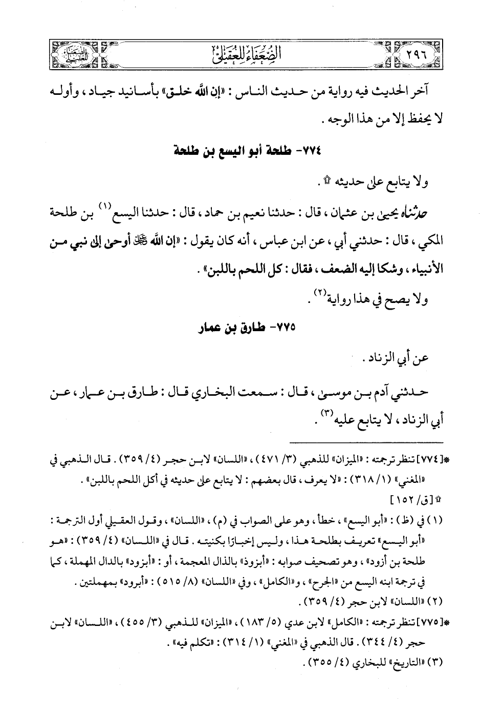 (5) * [775] تنظر ترجمته: «الكامل» لابن عدي (5/ 183) , «الميزان» للذهبي (3/ 455) , «اللسان» لابن حجر (4/ 344). قال الذهبي في «المغني» (1/ 314): «تكلم فيه».