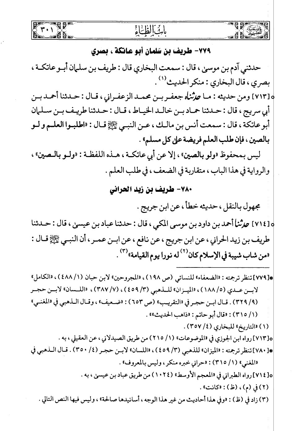 (4) * [780] تنظر ترجمته: «الميزان» للذهبي (3/ 459) , «اللسان» لابن حجر (4/ 350). قال الذهبي في «المغني» (1/ 315): «حراني خبره منكر، وليس بالمعروف».