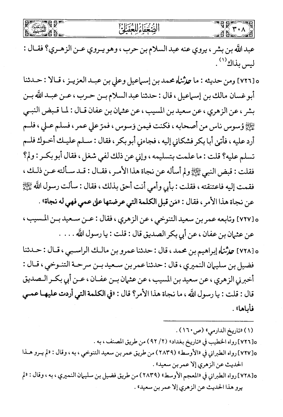 (4) [728] رواه الطبراني في «المعجم الأوسط» (2839) من طريق فضيل بن سليمان النميري، به، وقال: «لم يرو هذا الحديث عن الزهري إلا عمر بن سعيد».