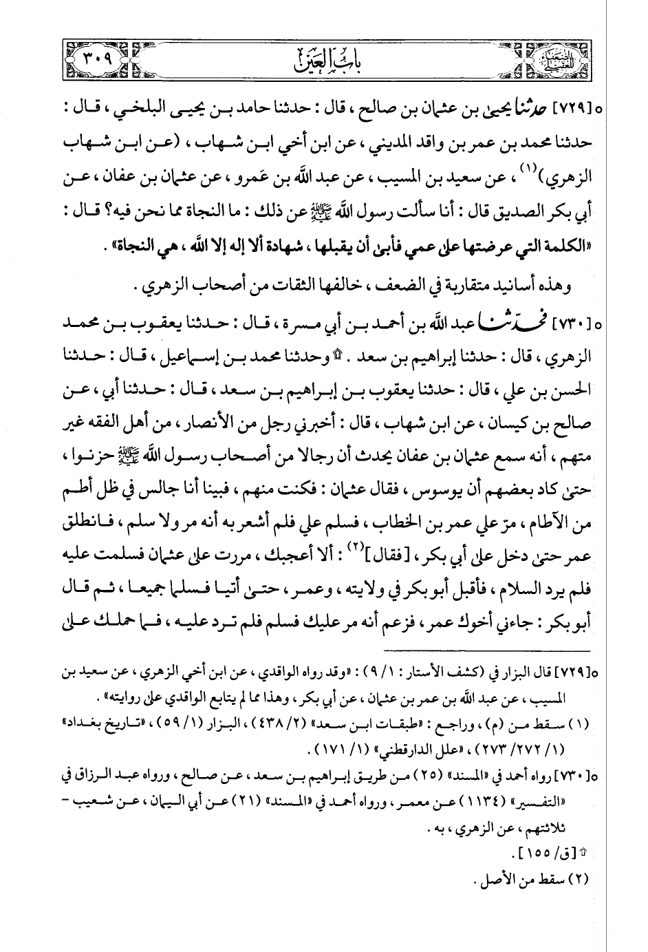 (1) [729] قال البزار في (كشف الأستار: 1/ 9): «وقد رواه الواقدي، عن ابن أخي الزهري، عن سعيد بن المسيب، عن عبد الله بن عمر بن عثمان، عن أبي بكر، وهذا مما لم يتابع الواقدي على روايته».