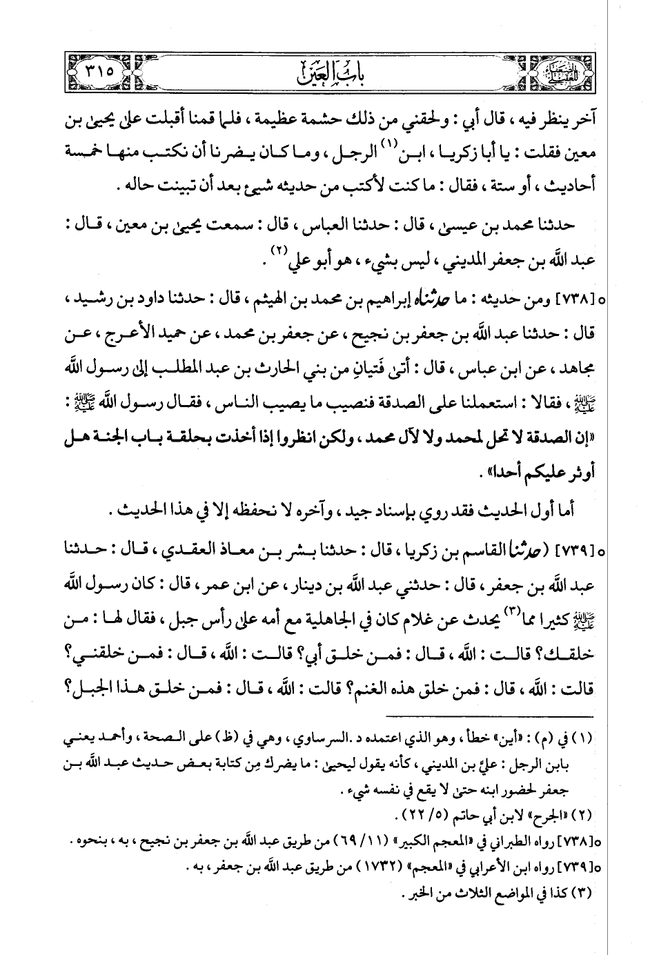 حدثنا محمد بن عيسى، قال: حدثنا العباس، قال: سمعت يحيى بن معين، قال: عبد الله بن جعفر المديني، ليس بشيء، هو أبو علي (2).