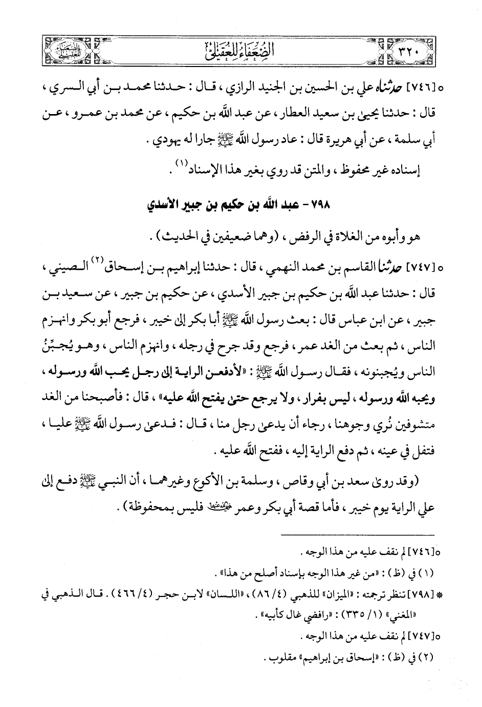 [747] (4) حدثنا القاسم بن محمد النهمي، قال: حدثنا إبراهيم بن إسحاق (5) الصيني، قال: حدثنا عبد الله بن حكيم بن جبير الأسدي، عن حكيم بن جبير، عن سعيد بن جبير، عن ابن عباس قال: بعث رسول الله صلى الله عليه وسلمع أبا بكر إلى خيبر، فرجع أبو بكر وانهزم الناس، ثم بعث من الغد عمر، فرجع وقد جرح في رجله، وانهزم الناس، وهو يُجبِّنُ الناس ويُجبنونه، فقال رسول الله صلى الله عليه وسلمع: «لأدفعن الراية إلى رجل يحب الله ورسوله، ويحبه الله ورسوله، ليس بفرار، ولا يرجع حتى يفتح الله عليه»، قال: فأصبحنا من الغد متشوفين نُري وجوهنا، رجاء أن يدعى رجل منا، قال: فدعى رسول الله صلى الله عليه وسلمع عليا، فتفل في عينه، ثم دفع الراية إليه، ففتح الله عليه.