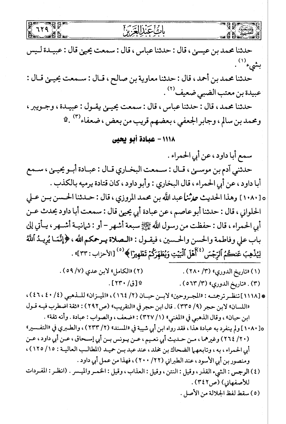 (5) * [1118] تنظر ترجمته: «المجروحين» لابن حبان (2/ 164) , «الميزان» للذهبي (4/ 40، 46) , «اللسان» لابن حجر (9/ 335). قال ابن حجر في «التقريب» (ص292): «ثقة اضطرب فيه قول ابن حبان» , وقال الذهبي في «المغني» (1/ 327): «ضعف، والصواب: عبادة. وأنه ثقة».