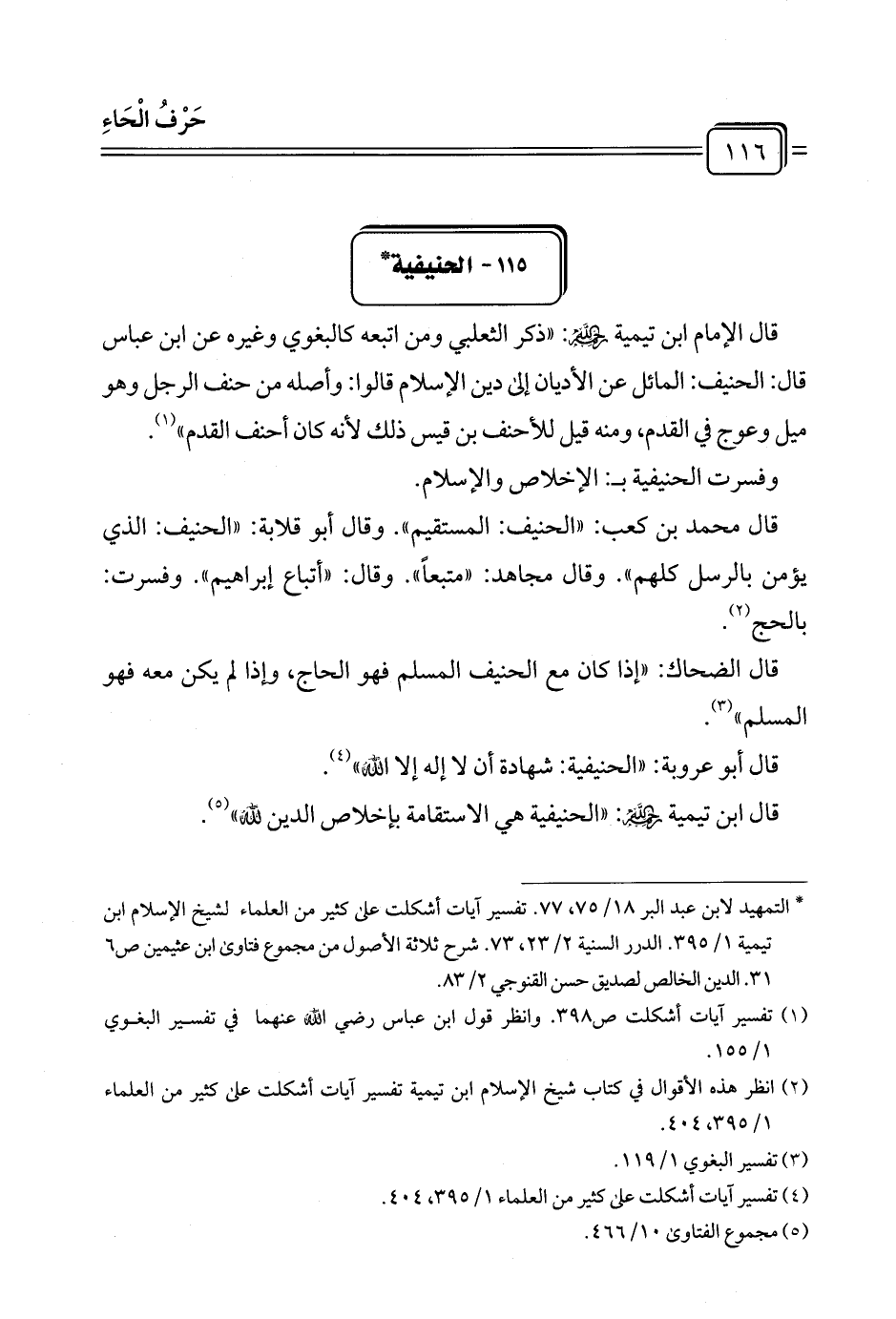 قال ابن تيمية رحمهُ اللهُ: "الحنيفية هي الاستقامة بإخلاص الدين لله" (¬٥).