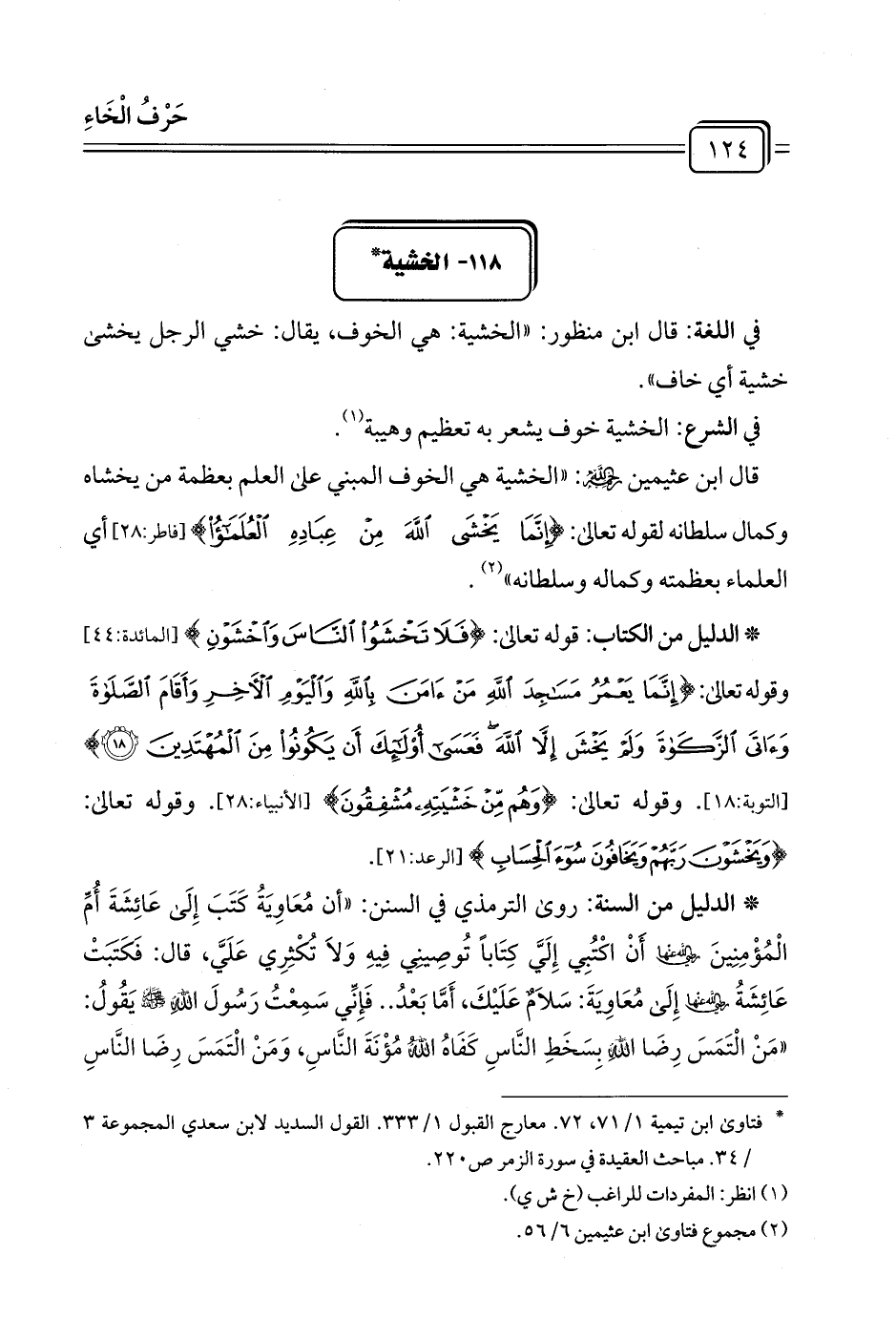 قال ابن عثيمين رحمهُ اللهُ: "الخشية هي الخوف المبني على العلم بعظمة من يخشاه وكمال سلطانه لقوله تعالى: {إِنَّمَا يَخْشَى اللَّهَ مِنْ عِبَادِهِ الْعُلَمَاءُ} [فاطر:٢٨] أي العلماء بعظمته وكماله وسلطانه" (¬٢).