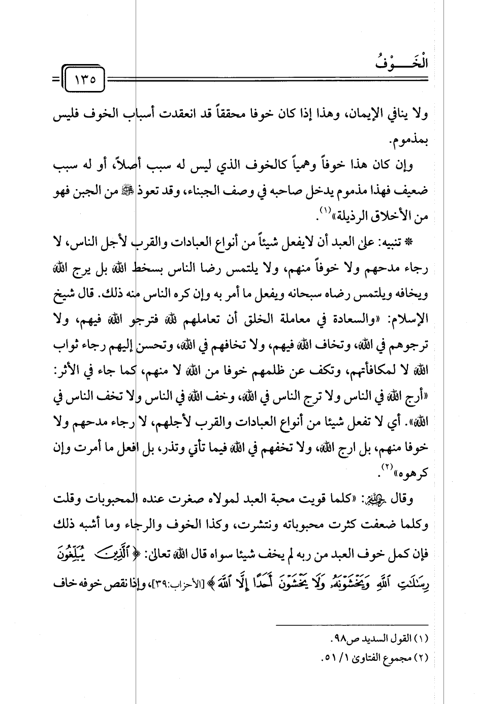 وقال رحمهُ اللهُ: "كلما قويت محبة العبد لمولاه صغرت عنده المحبوبات وقلت وكلما ضعفت كثرت محبوباته ونتشرت، وكذا الخوف والرجاء وما أشبه ذلك فإن كمل خوف العبد من ربه لم يخف شيئا سواه قال الله تعالى: {الَّذِينَ يُبَلِّغُونَ رِسَالَاتِ اللَّهِ وَيَخْشَوْنَهُ وَلَا يَخْشَوْنَ أَحَدًا إِلَّا اللَّهَ} [الأحزاب:٣٩]، وإذا نقص خوفه خاف
