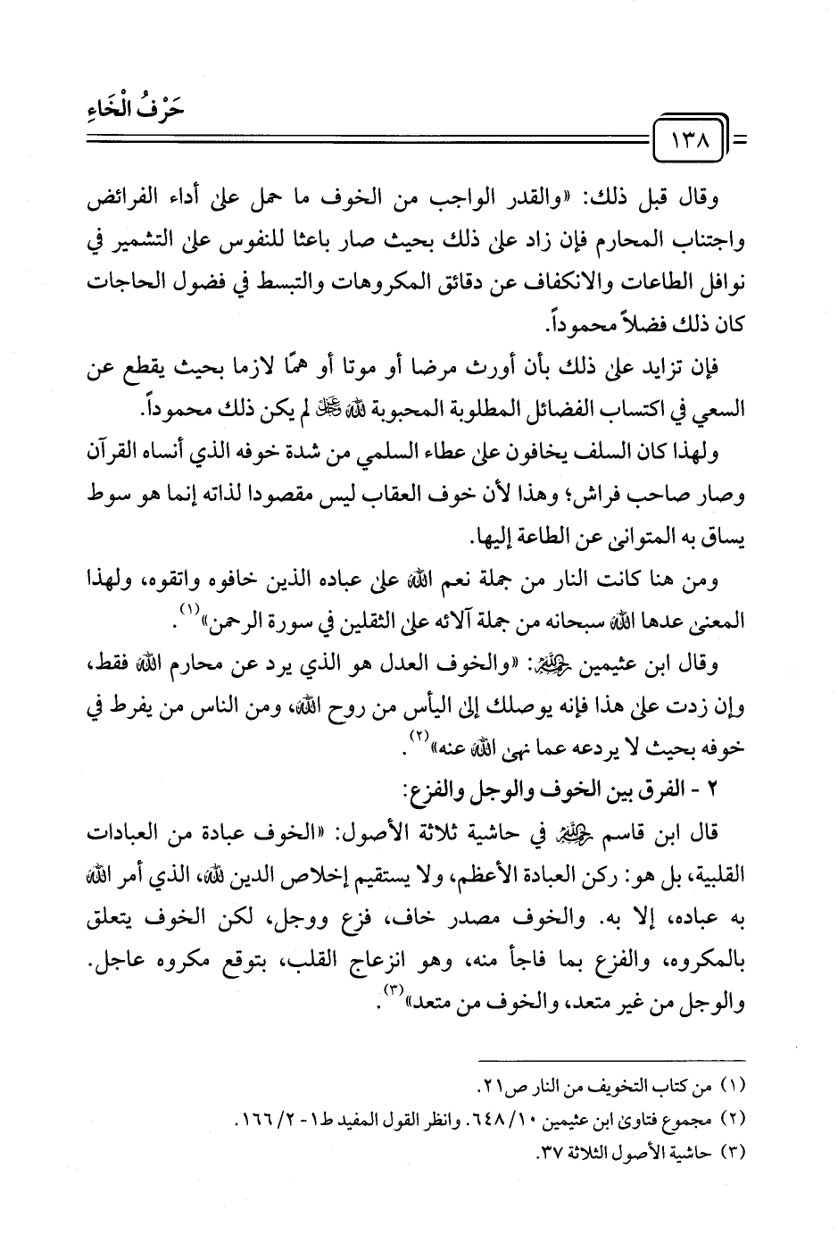 وقال قبل ذلك: "والقدر الواجب من الخوف ما حمل على أداء الفرائض واجتناب المحارم فإن زاد على ذلك بحيث صار باعثا للنفوس على التشمير في نوافل الطاعات والانكفاف عن دقائق المكروهات والتبسط في فضول الحاجات كان ذلك فضلًا محمودًا.