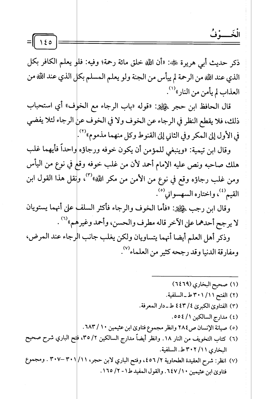 وقال ابن رجب رَحِمَه الله: "فأما الخوف والرجاء فأكثر السلف أنهما يستويان لا يرجح أحدهما على الآخر قاله مطرف والحسن، وأحمد وغيرهم" (¬٦).